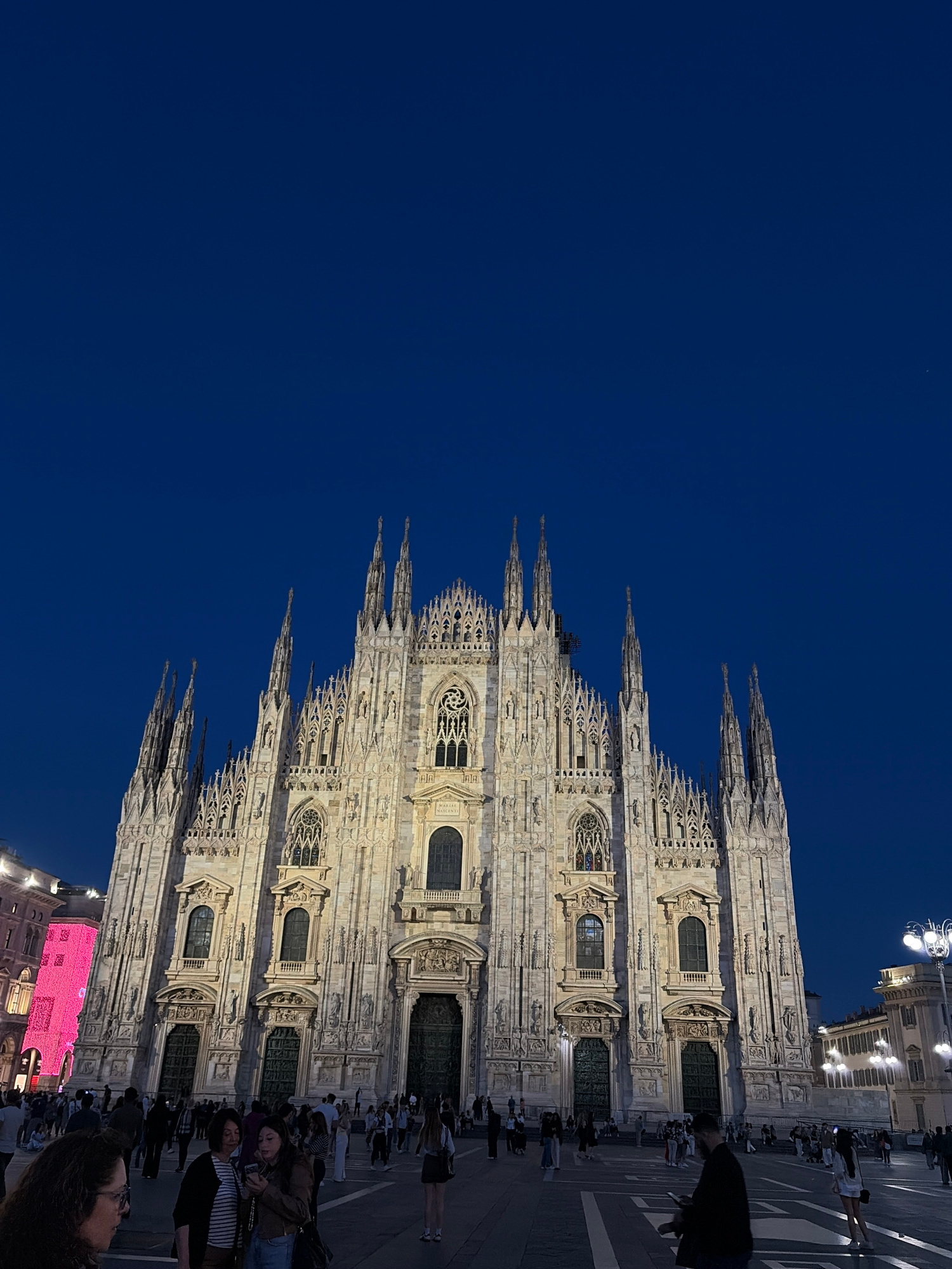 The image captures the majestic Milan Cathedral (Duomo di Milano) at night, its intricate white marble facade brilliantly illuminated against a deep, dark blue sky. The grand Gothic architecture, with…read more