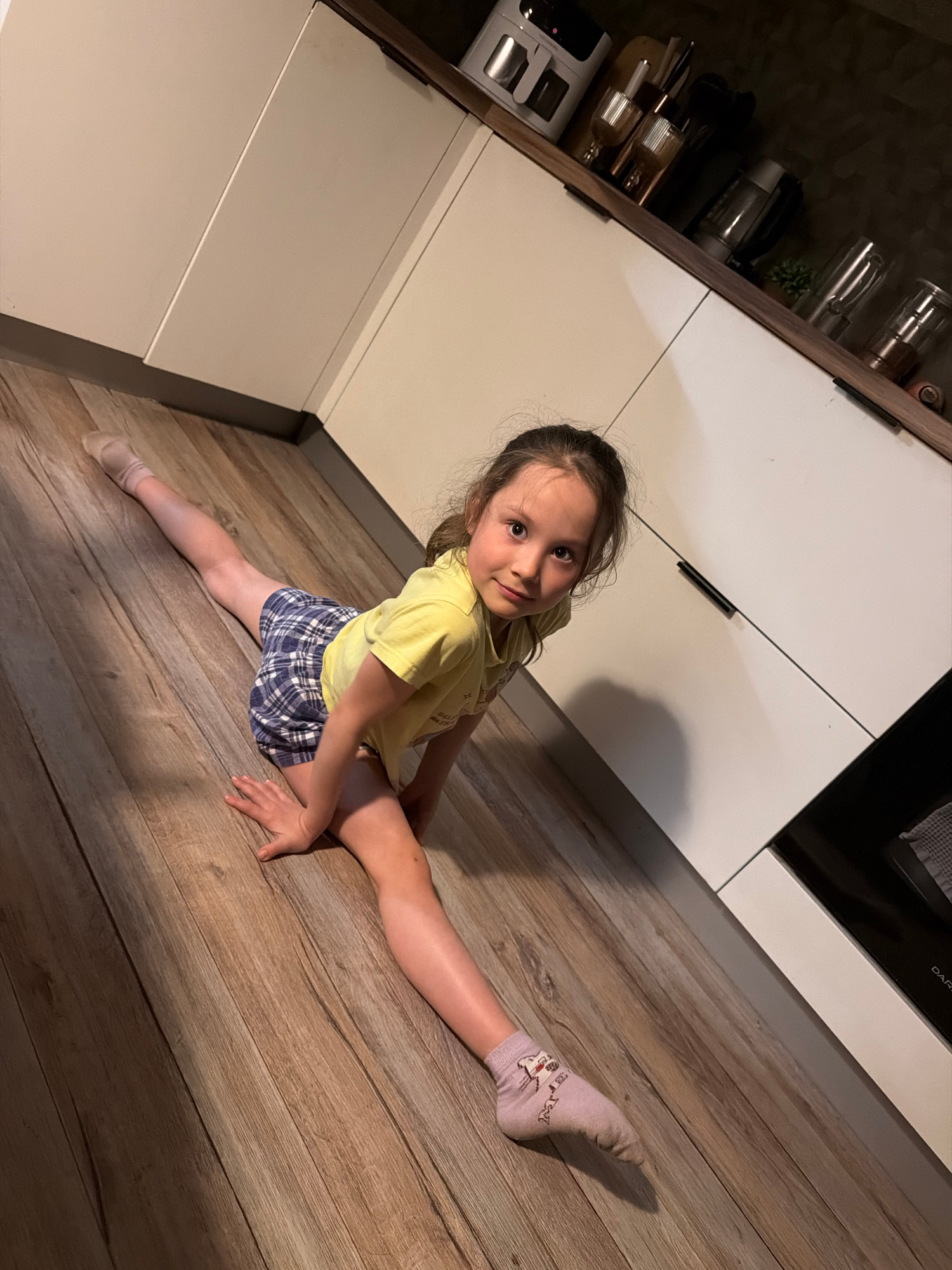 A young girl in a yellow t-shirt and blue and white plaid shorts is doing a split on a wooden floor next to white kitchen cabinets. She is wearing a sock on each foot. The location is likely inside a…read more