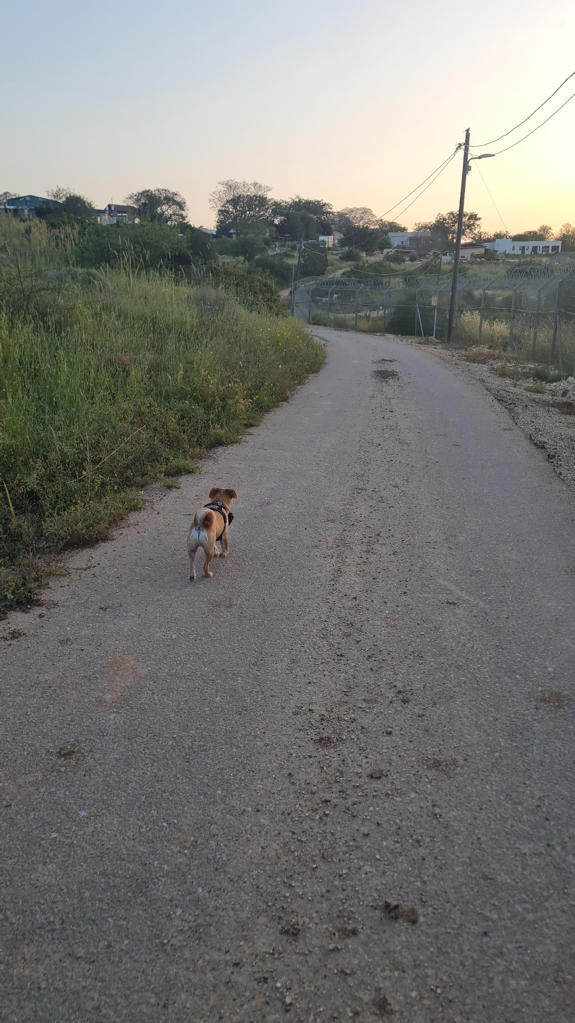 The image shows a dog walking on a road in Lachish Regional Council, Israel. The road is asphalt and runs through a rural area with vegetation on the side of the road. In the distance are houses and p…read more