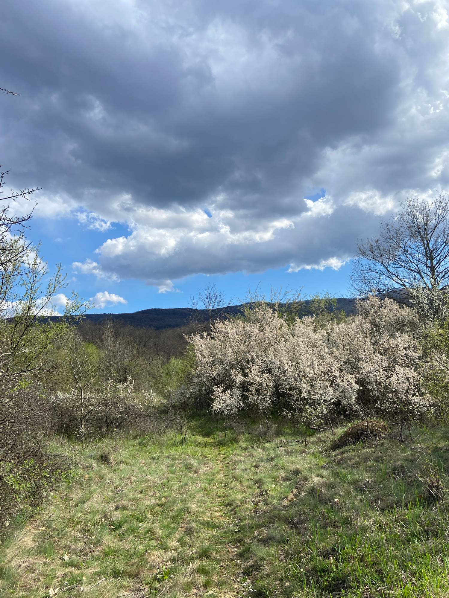 The image depicts a landscape near Mindia, Bulgaria. The scene includes a grassy hillside on the right side of the image. Adjacent to the hillside, a band of flowering trees is visible. To the left, the sky is divided between dark, imposing storm clouds and patches of blue sky with white clouds. Bare branches of trees are visible in the bottom left and upper portion of the frame. The photograph is oriented vertically. | Open Wire