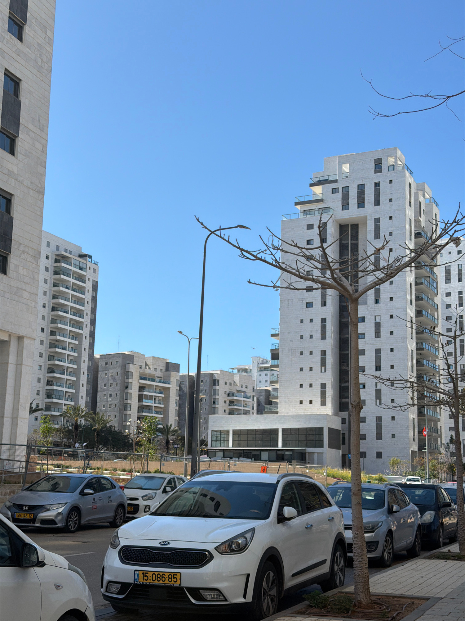 The image shows a street scene in Netanya, Israel, featuring modern residential buildings under a clear blue sky. The architecture is characterized by white stone facades with repetitive window patter…read more