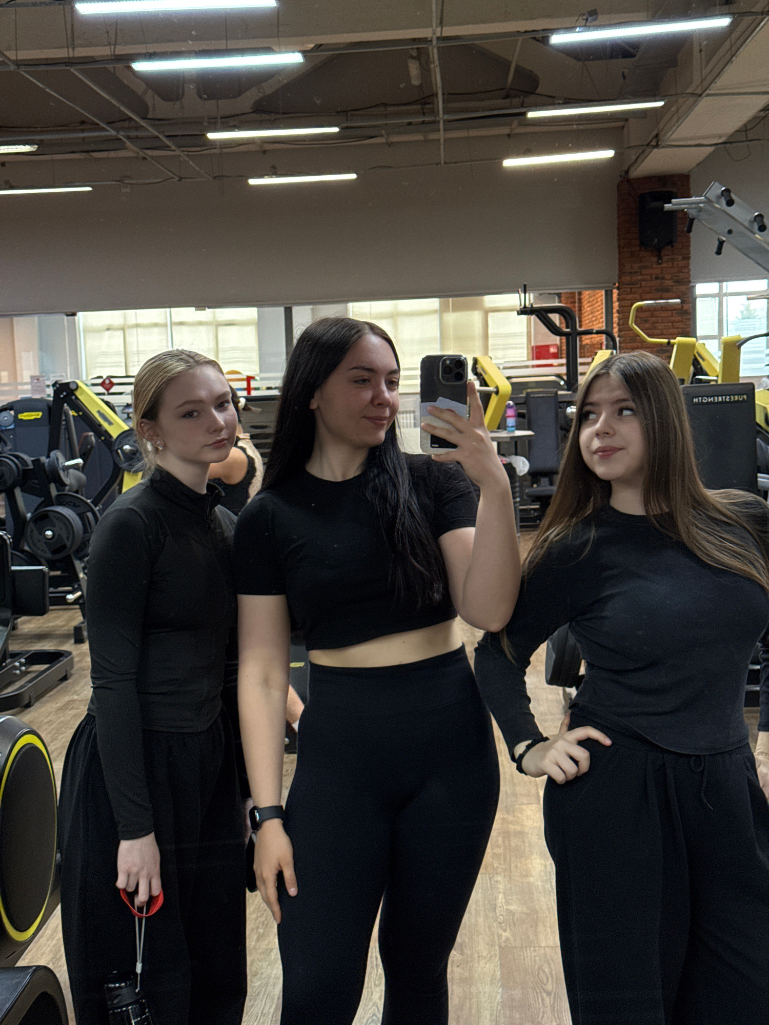 Three women are in a gym in the city of Chaikovsky, Russia. They are posing for a selfie. The woman in the middle is holding the phone. They are all dressed in black workout clothes. Behind them are v…read more