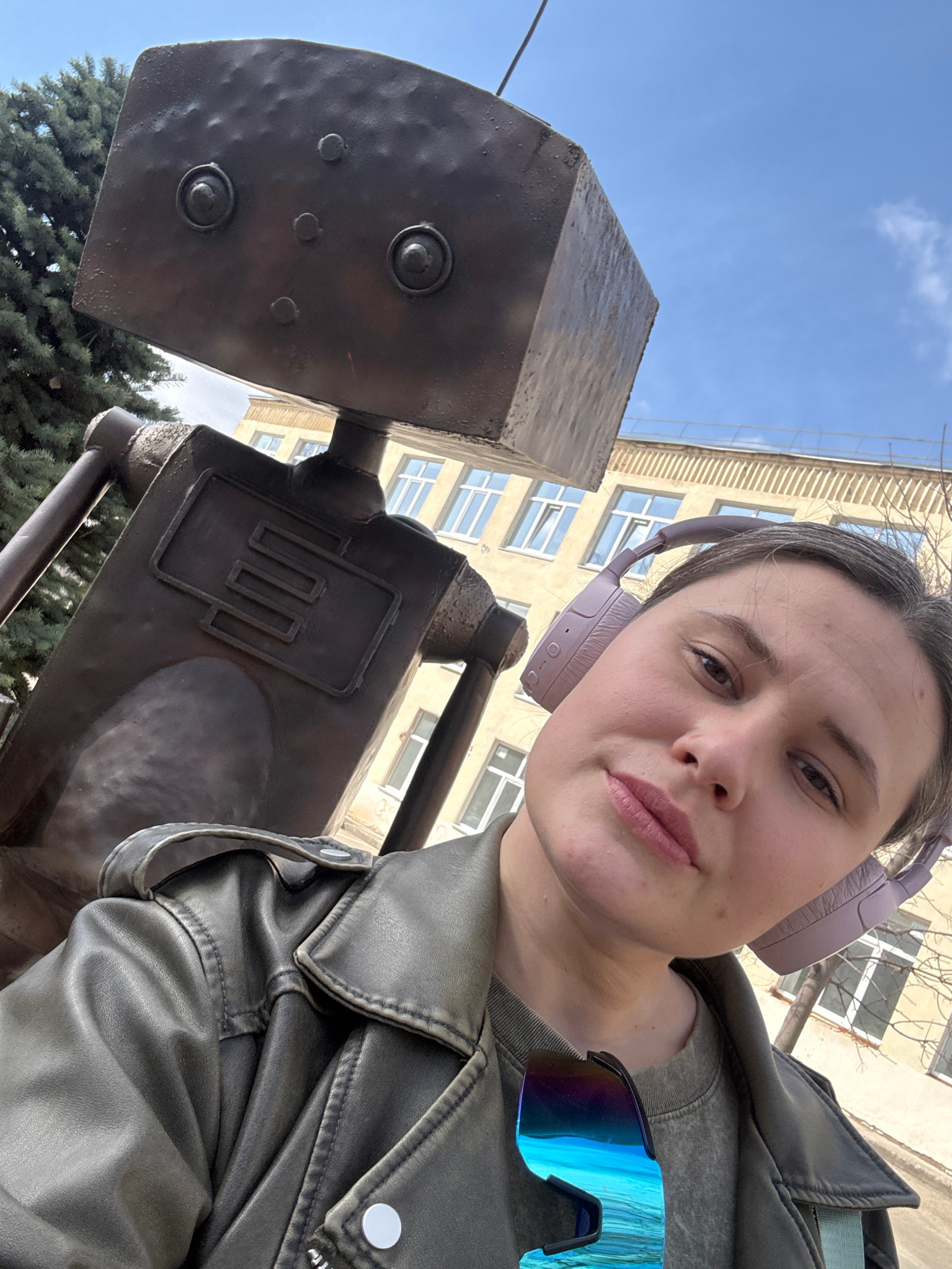 A young woman poses for a selfie with a metal sculpture of a robot in Chaikovsky, Russia. The robot has a square head with two round eyes and a rectangular body. The woman wears headphones and a leath…read more