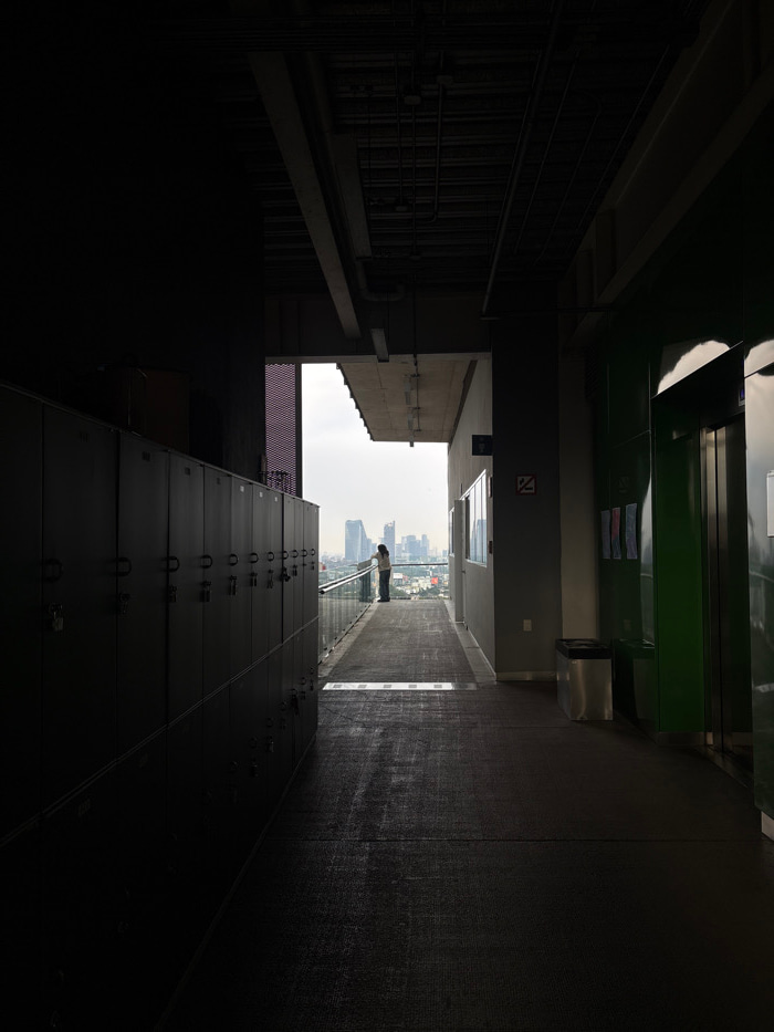 The image displays an interior hallway transitioning to an outdoor balcony overlooking a cityscape in Mexico City, Mexico. On the left, a long row of dark grey metal lockers, arranged in two horizonta…read more