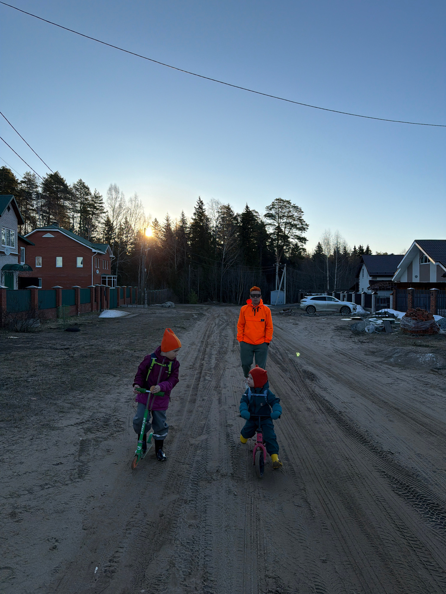 The image depicts a street scene with an unpaved road surface marked with tire tracks. Two children on scooters and an adult are walking along the road. One child is wearing a purple jacket and an oraβ¦read more