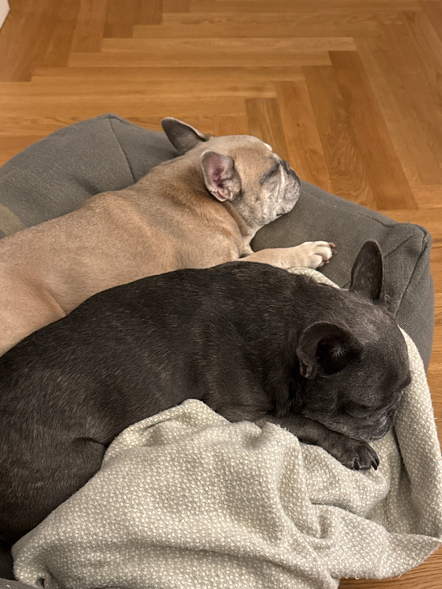 Two French Bulldogs are sleeping on a grey dog bed. One dog is tan and the other is black. A light grey blanket is partially covering the black dog. The floor is wooden parquet. The location is presum…read more
