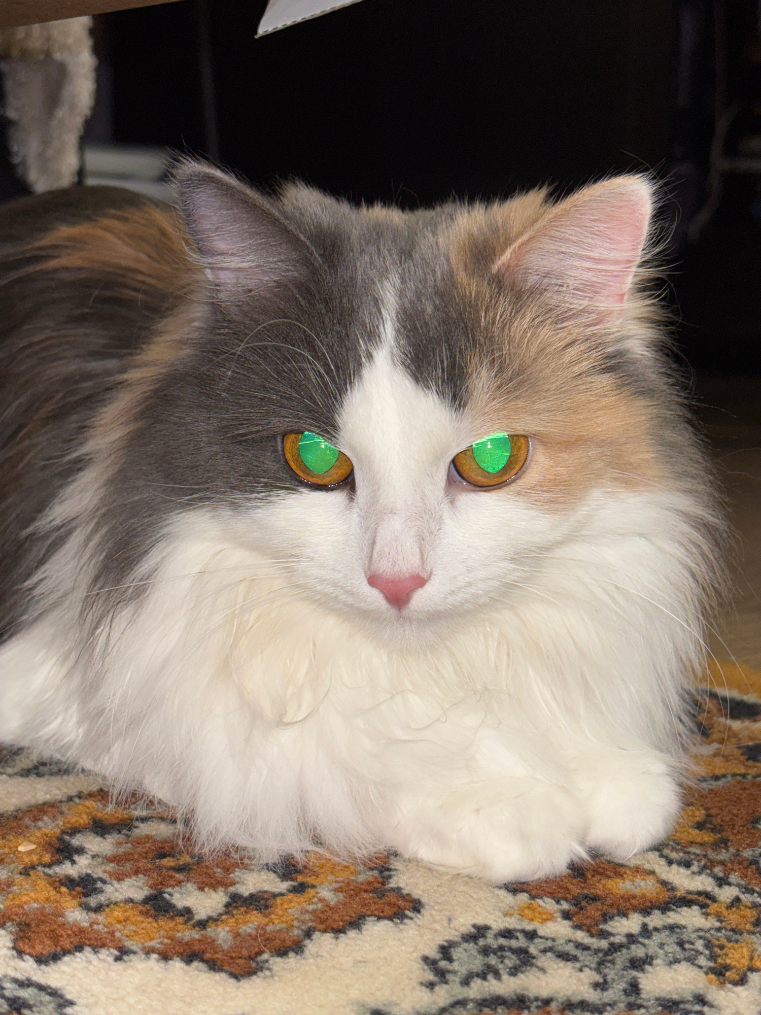 A close-up, slightly angled, indoor photograph shows a long-haired cat with striking green eyes. The cat has a calico pattern with patches of white, gray, and brown fur. Its nose is pink. The cat is l…read more