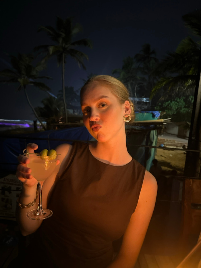 A young woman with blonde hair pulled back is holding a martini glass with two olives. She wears a dark sleeveless dress and gold hoop earrings, her expression playful. Palm trees and dim lights form…read more
