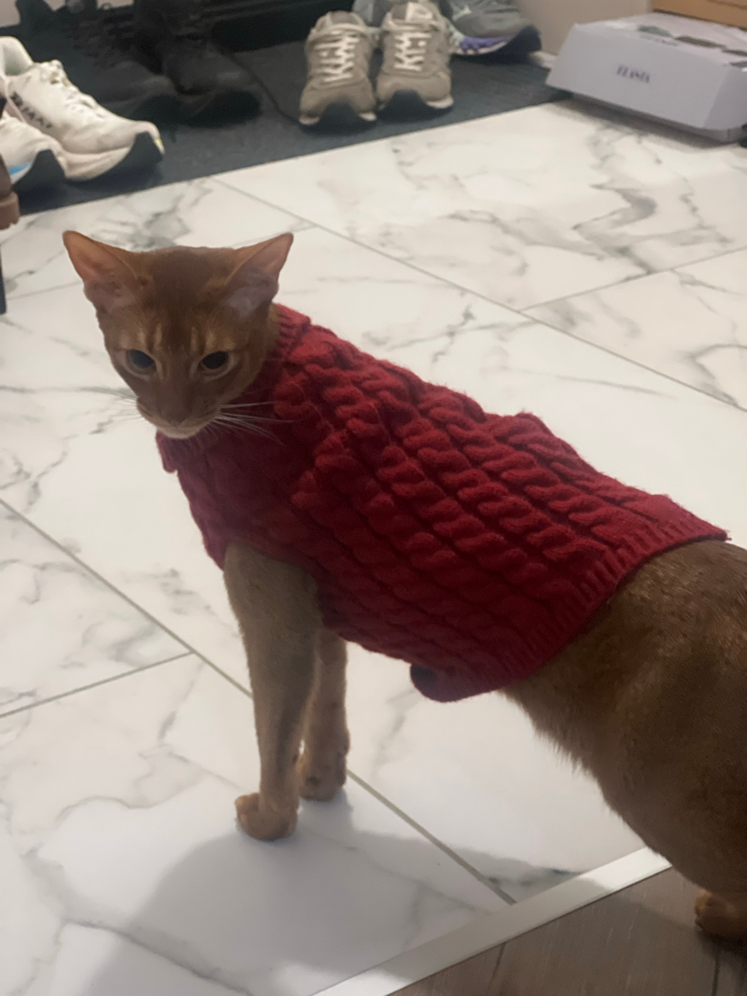 An Abyssinian cat, with short, reddish-brown fur, stands centrally in an indoor setting in Kazan, Russia. The cat is wearing a dark red knitted sweater featuring a textured cable pattern. Its head is…read more