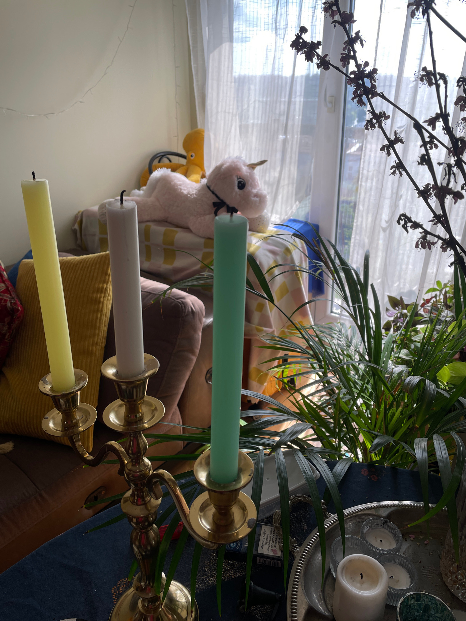 The image shows an interior scene with a window in the background covered by a sheer curtain. In front of the window, there is a plush unicorn toy with a dark ribbon around its neck. Various pillows a…read more