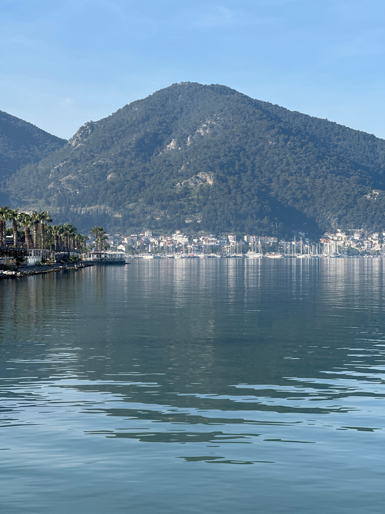 The image captures a wide shot of a bay in Fethiye, Turkey, under a clear, light blue sky. The foreground is dominated by calm, rippling water exhibiting reflections of the distant shoreline and mount…read more