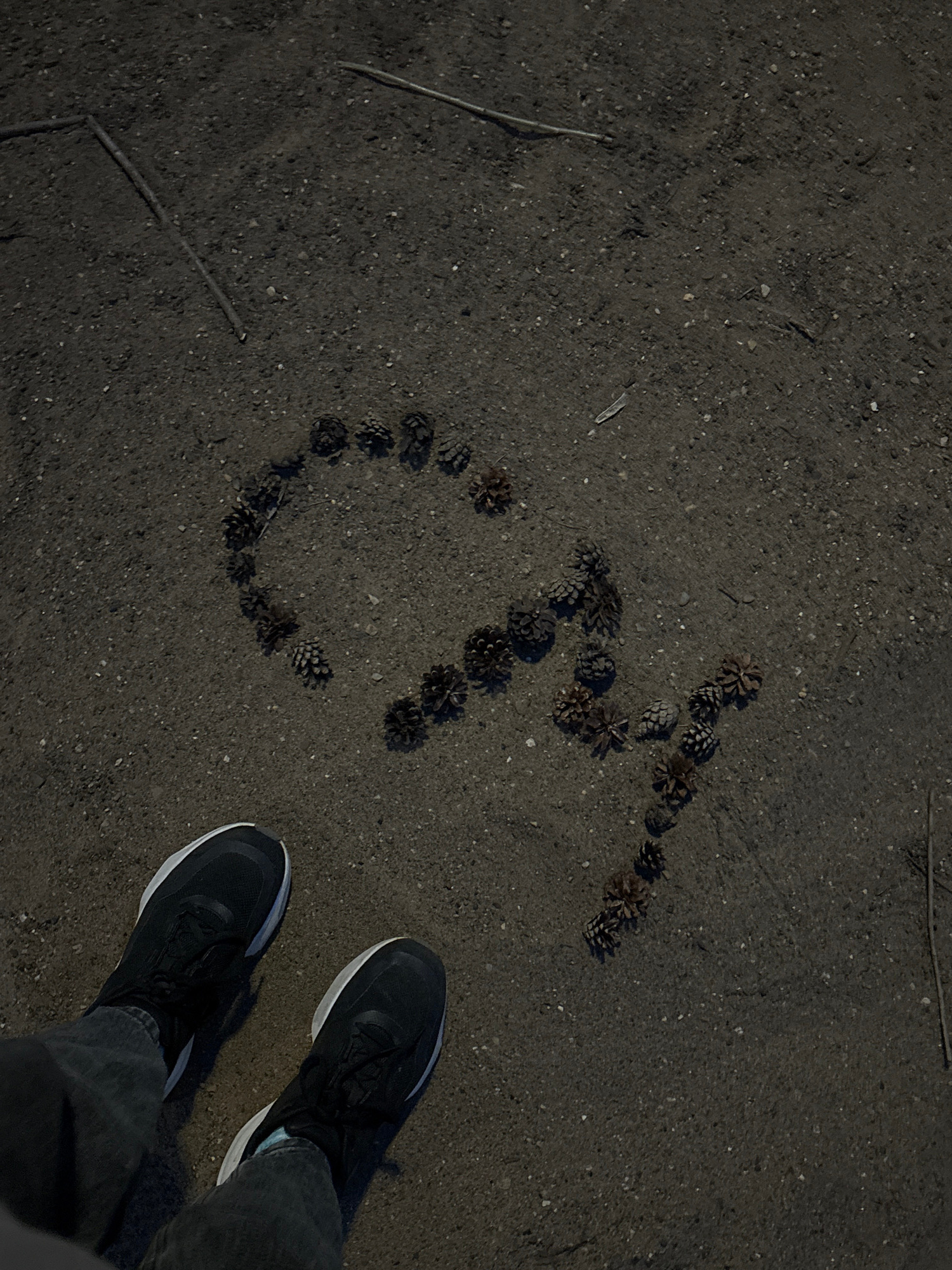 The image shows a ground surface covered in dark, granular material with scattered twigs and small rocks. Arranged on the ground, forming the Russian letters "Чай" (Chai), are numerous pine cones. A p…read more
