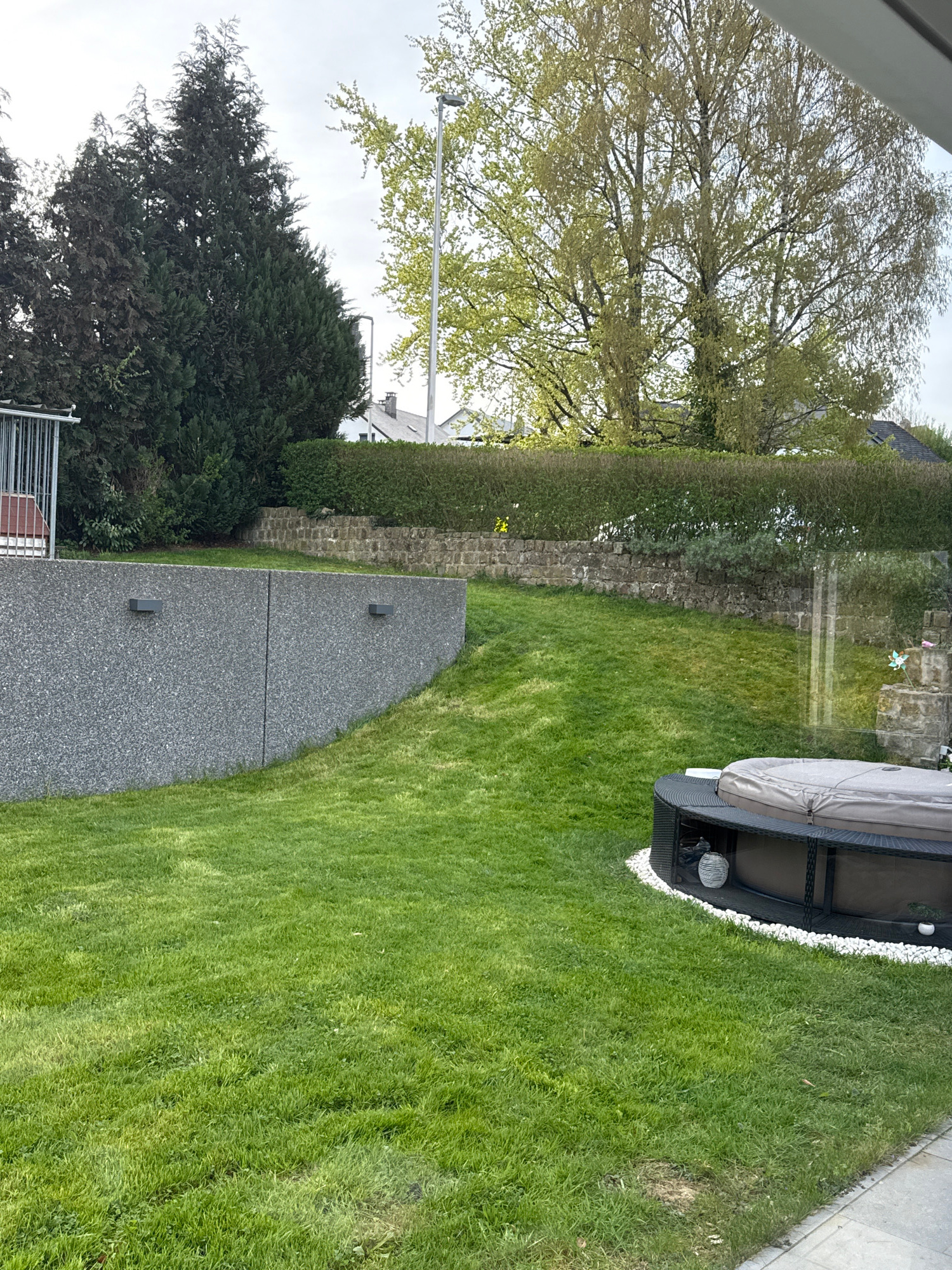 The image depicts a view from a window overlooking a backyard. The backyard features a green lawn, a gray stone pathway, and various trees and bushes. A covered outdoor seating area with white decorat…read more
