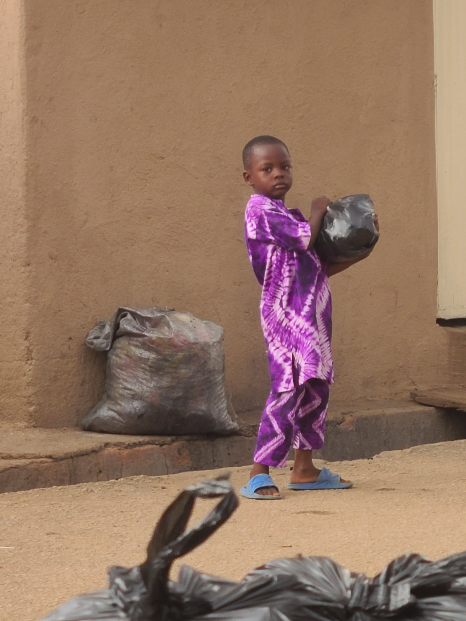 A child wearing a purple and white patterned garment and blue sandals carries a black plastic bag in Jos, Nigeria. The child stands on a dirt-colored ground next to a wall of similar color, with addit…read more