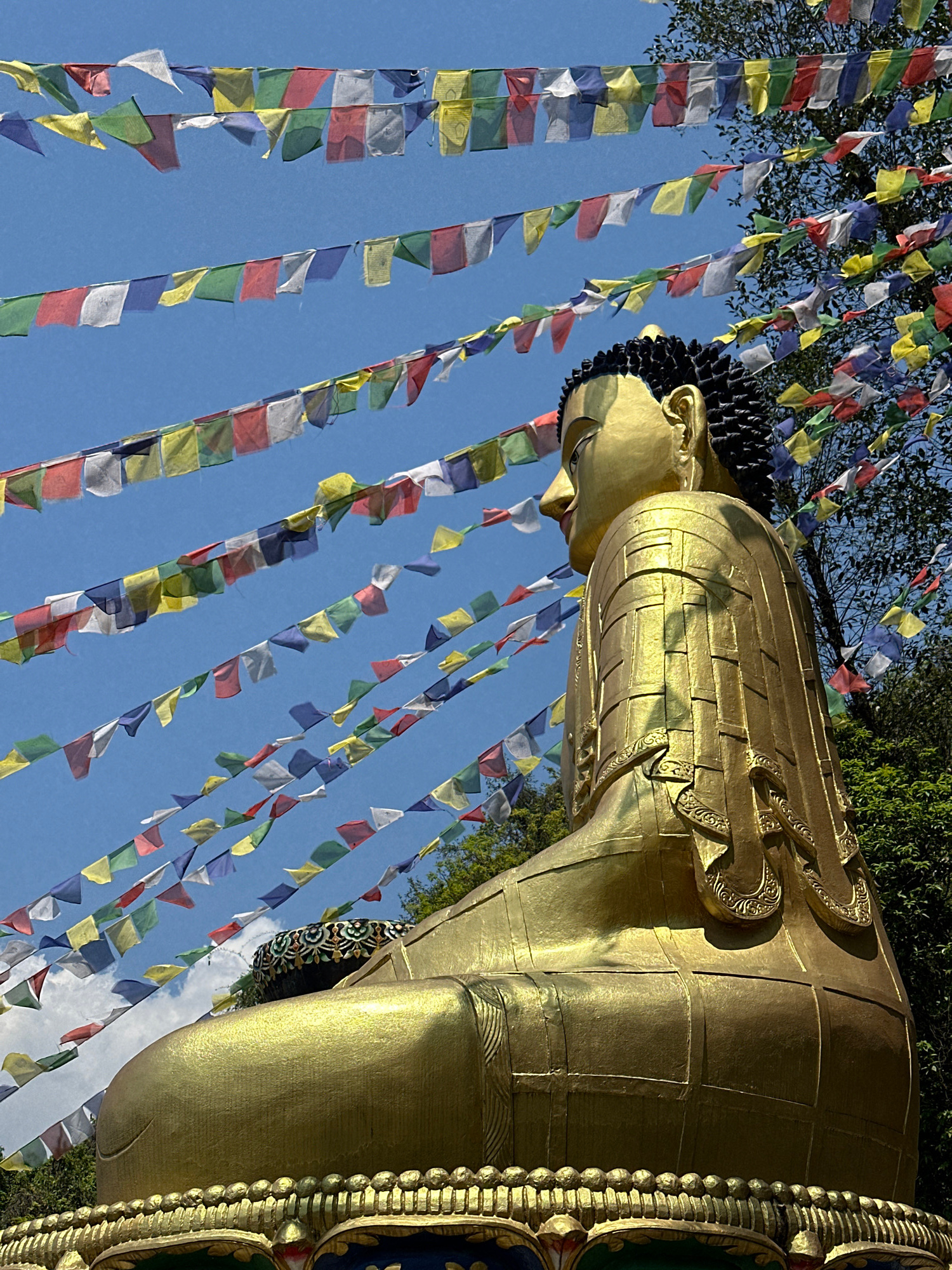 A ground-level shot shows a golden Buddha statue surrounded by colorful prayer flags in Pokhara, Nepal. The Buddha is gilded, and is adorned with a head of tight black curls. The statue's body appears…read more