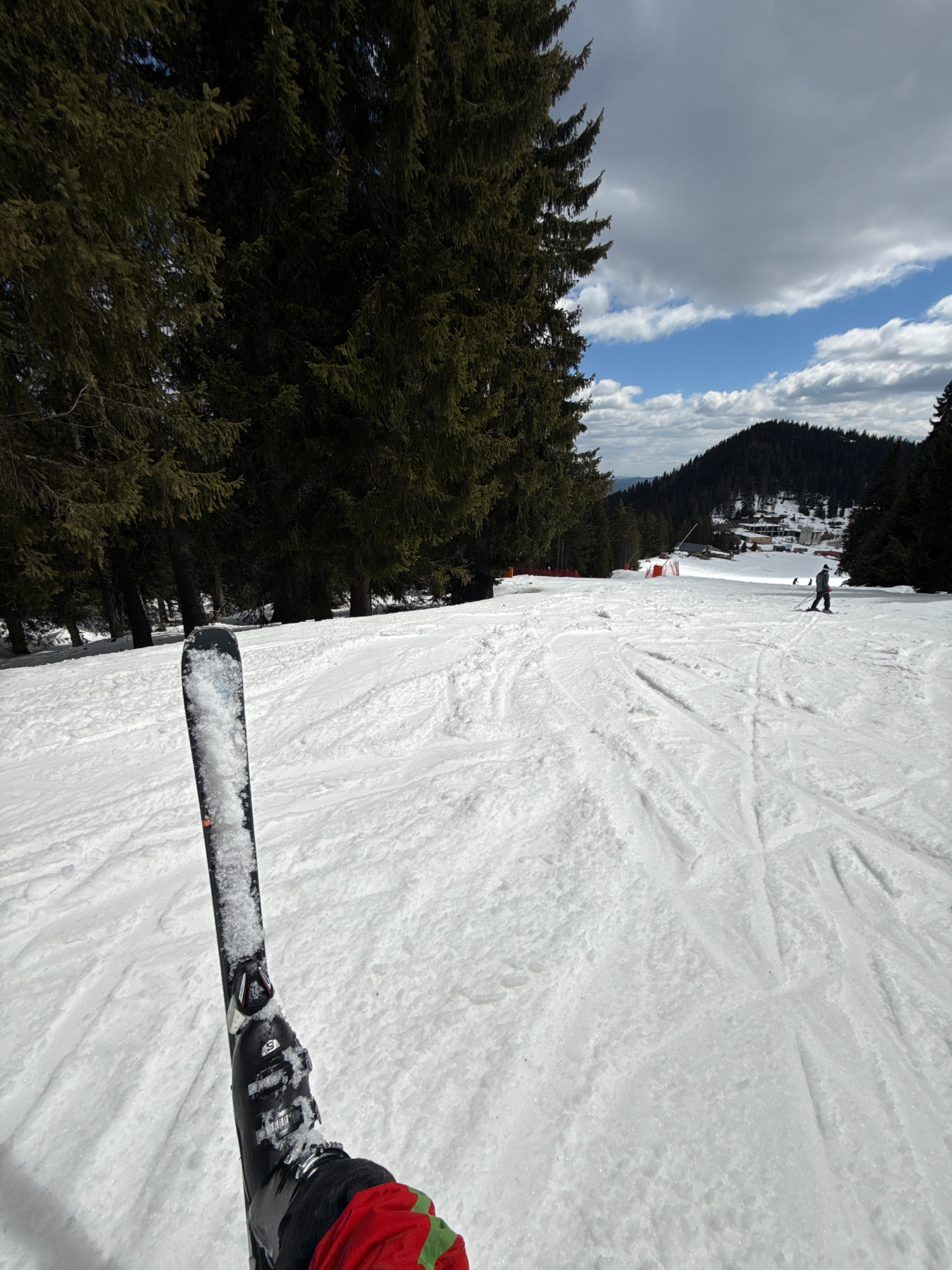 A skier is on a snow-covered slope with skis. The slope is bordered by trees. In the distance, there are buildings. The sky is visible above the trees. The location is Smolyan, Bulgaria.