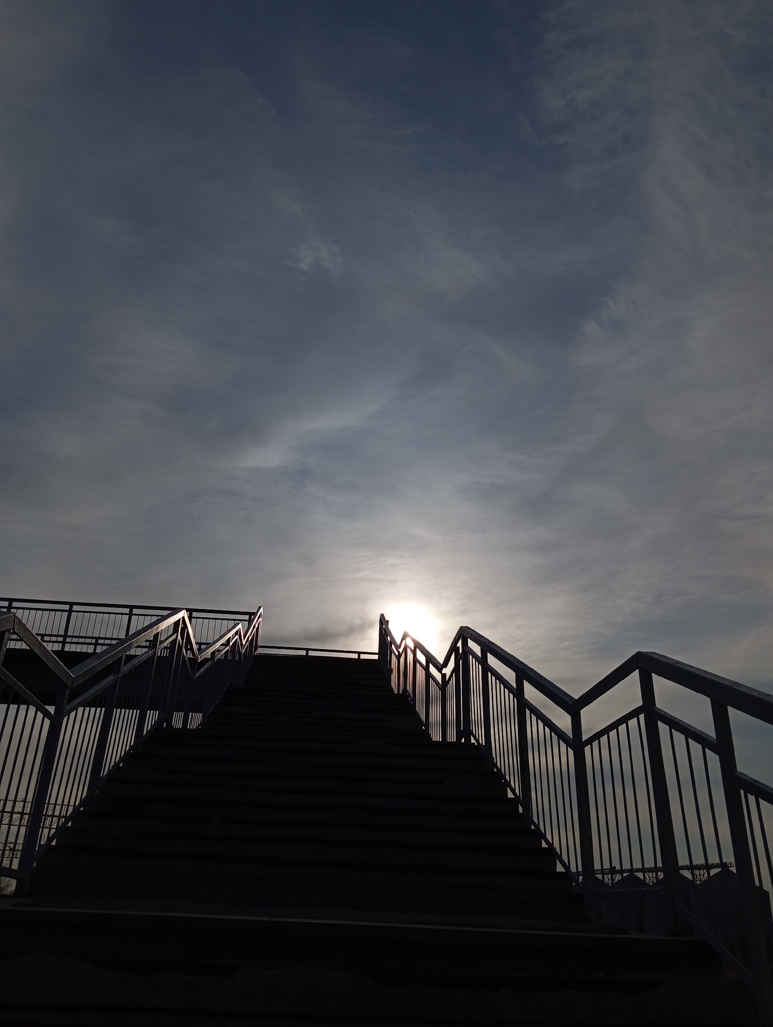 A low-angle photograph captures a metal staircase against a cloudy sky, likely taken outdoors during daylight. The metal of the staircase appears dark, nearly silhouetted, with sunlight peaking throug…read more