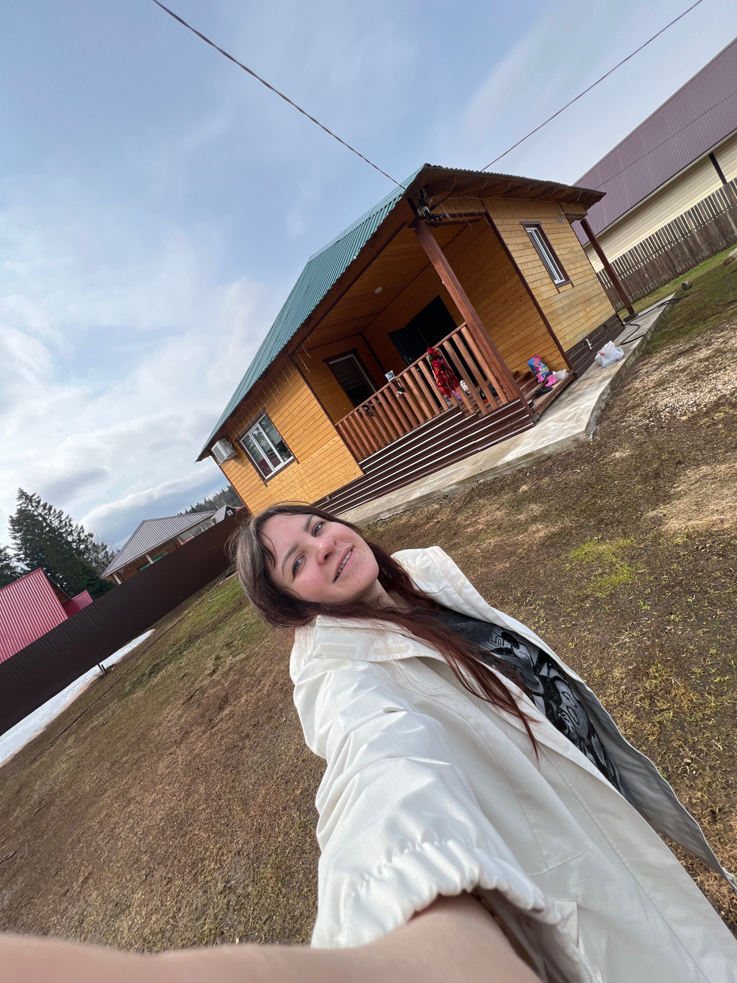 A woman with long brown hair, wearing a white jacket over a black and white patterned top, is taking a selfie outdoors. Behind her is a two-story wooden house with a green metal roof. The house has a…read more