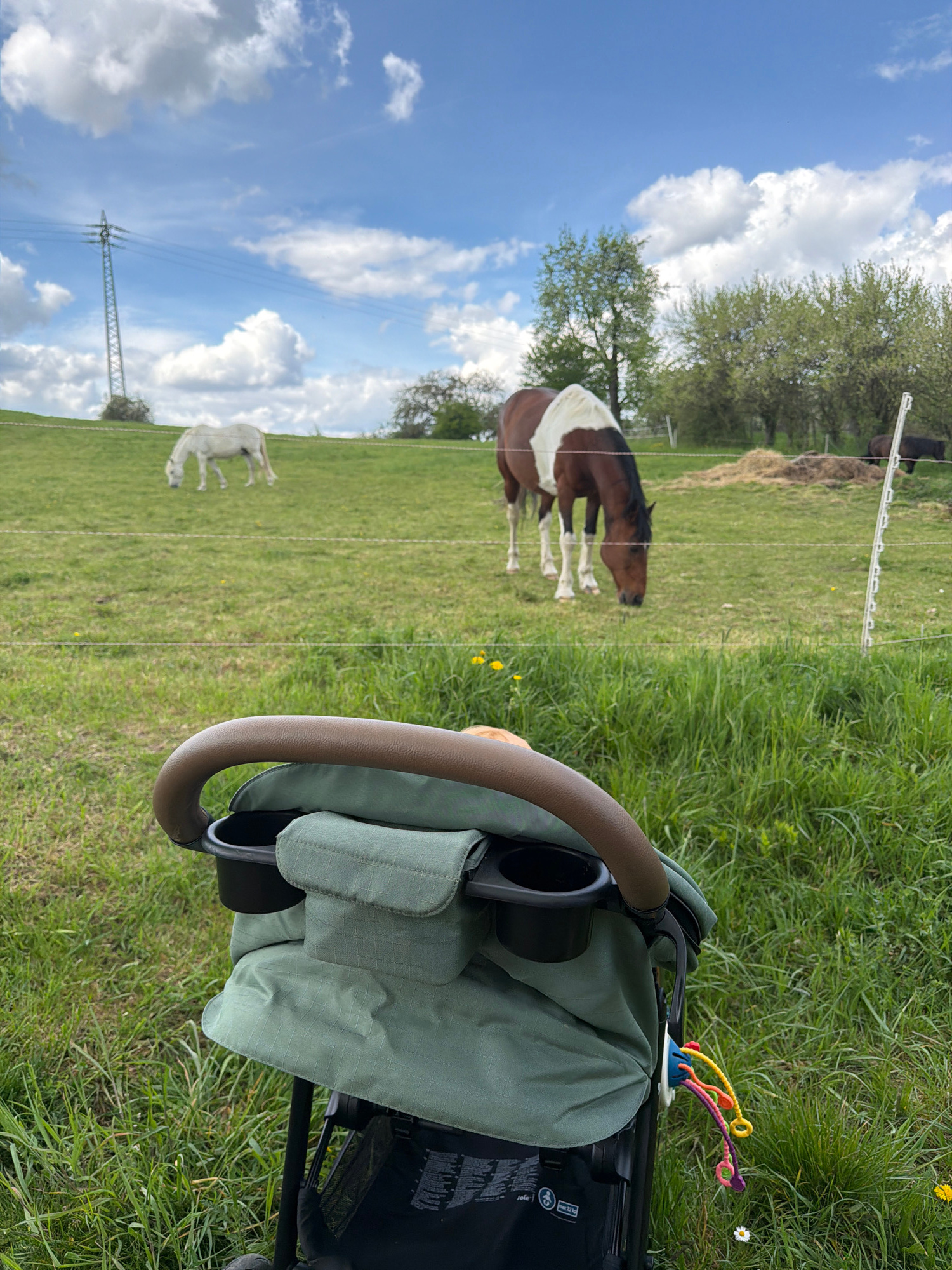 The image captures an outdoor scene from a low, personal perspective, looking across a grassy pasture towards animals and the sky. In the immediate foreground, part of a baby stroller or carriage is v…read more