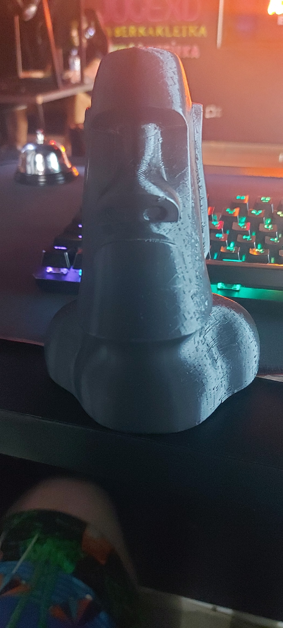 A gray, 3D-printed head sculpture rests on a surface next to a partially visible mechanical keyboard with colorful LED backlighting. The sculpture has a rough texture indicative of the printing proces…read more
