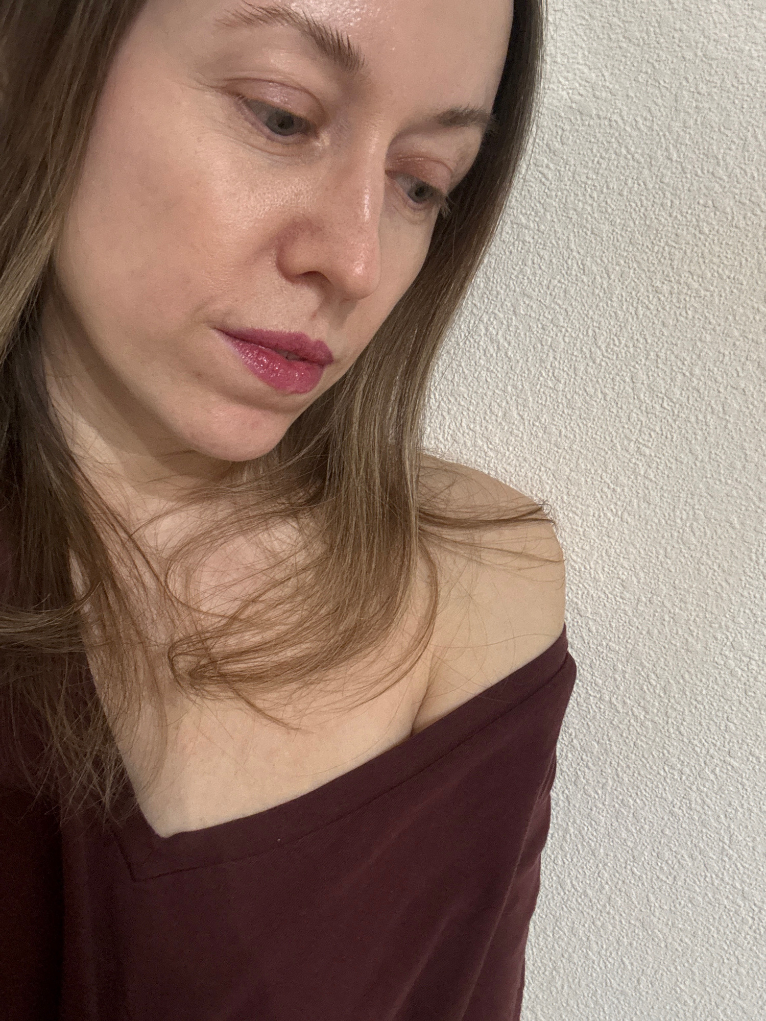 A close-up, high-angle portrait shot depicts the upper body of a light-skinned female individual in Kudrovo, Russia. Her head is tilted downwards and slightly to the left, her gaze directed towards th…read more