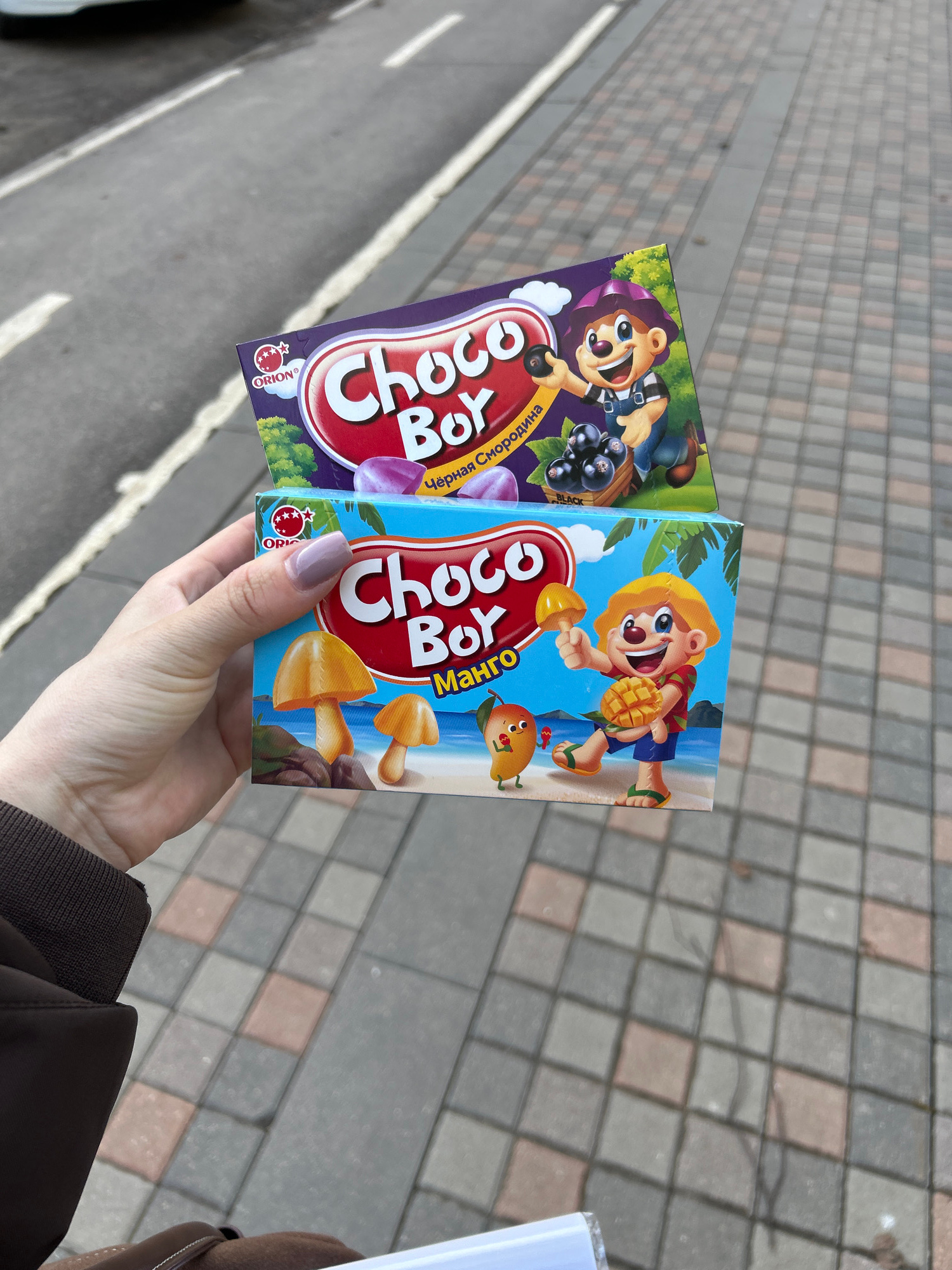 A woman's hand holds two small boxes of Choco Boy cookies. The box on the left has a purple background and features a cartoon boy with dark hair holding a black currant. The box on the right has a blu…read more