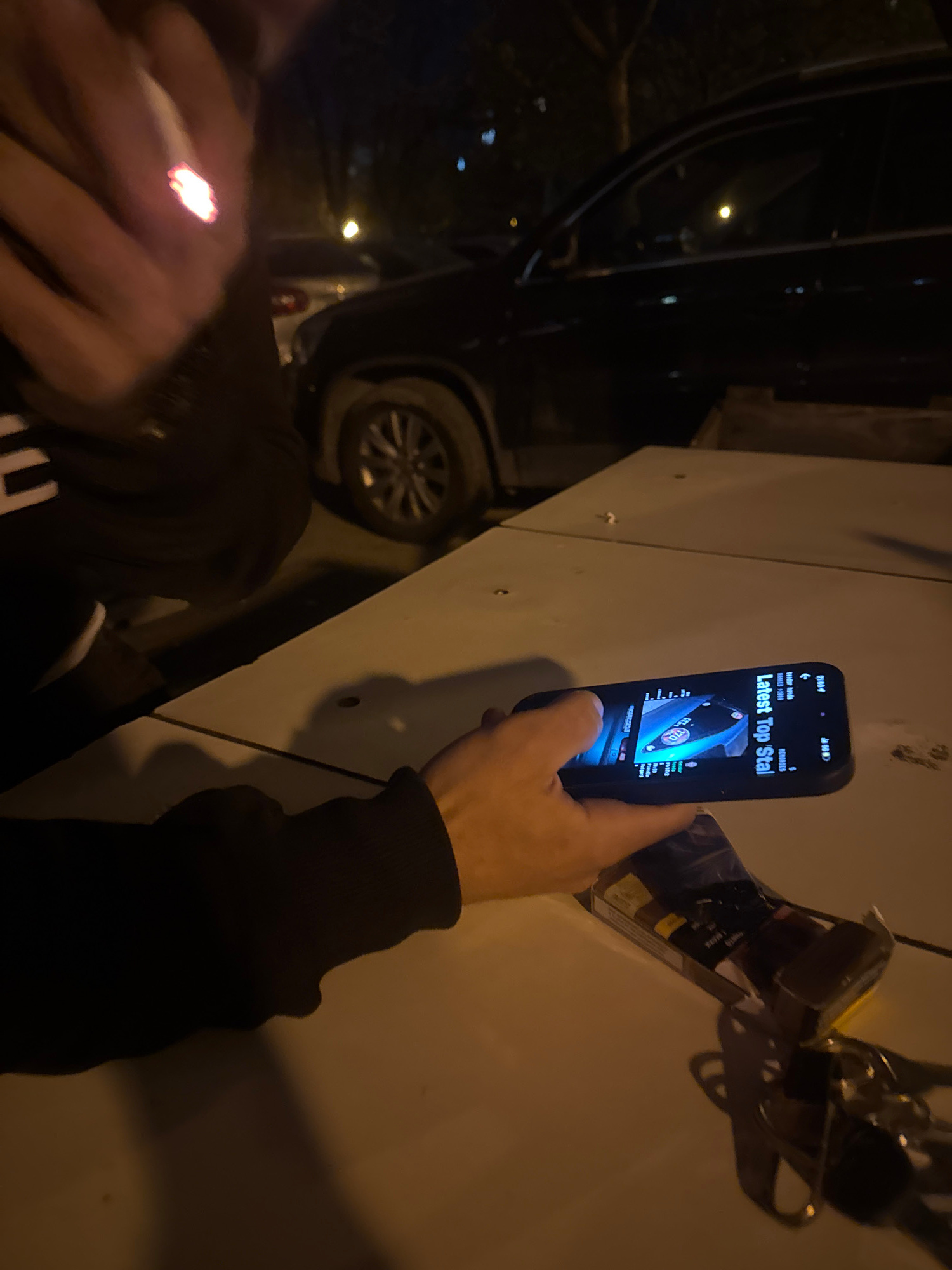 A person holds a lit cigarette in their left hand and a smartphone in their right hand. The phone displays a webpage titled "Latest Top Stal" with an image of a blue car. The person is standing next t…read more