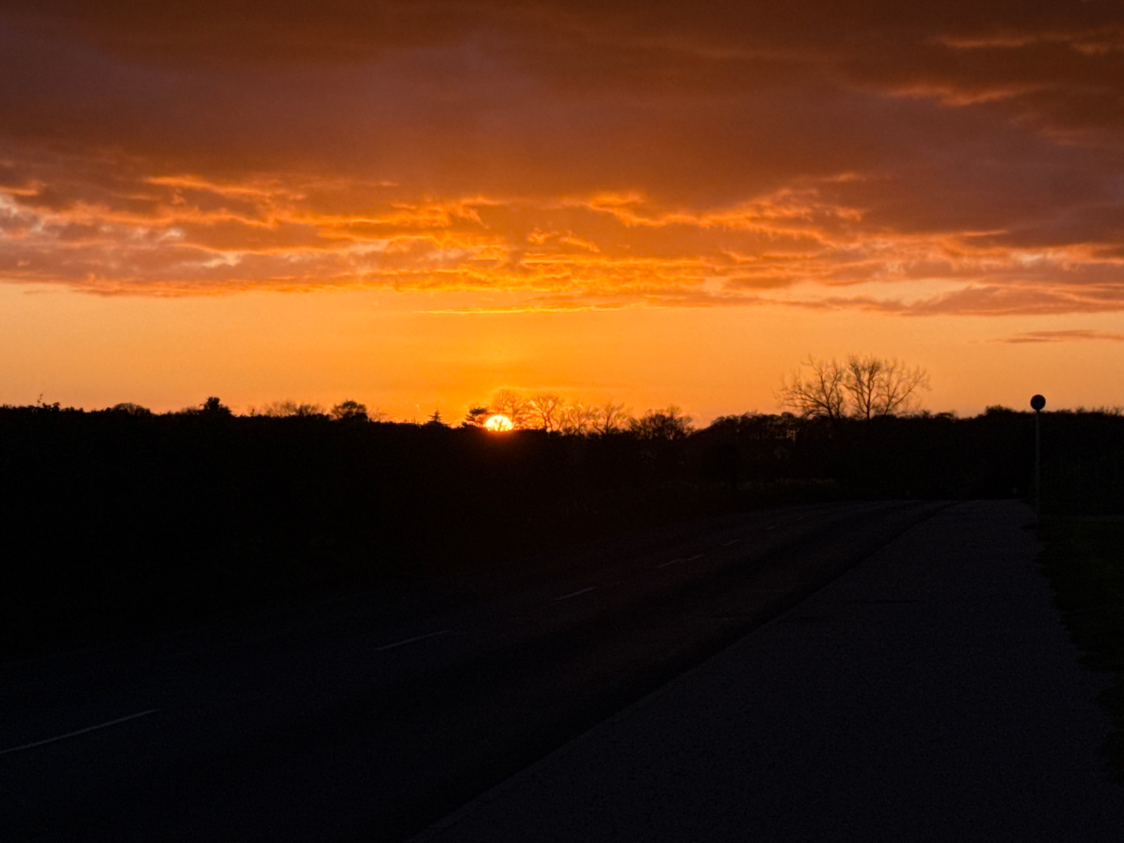 The image captures a sunset in Great Yarmouth, United Kingdom. The sun is partially obscured by a line of trees, casting a silhouette effect on the trees and vegetation in the foreground. The sky is f…read more
