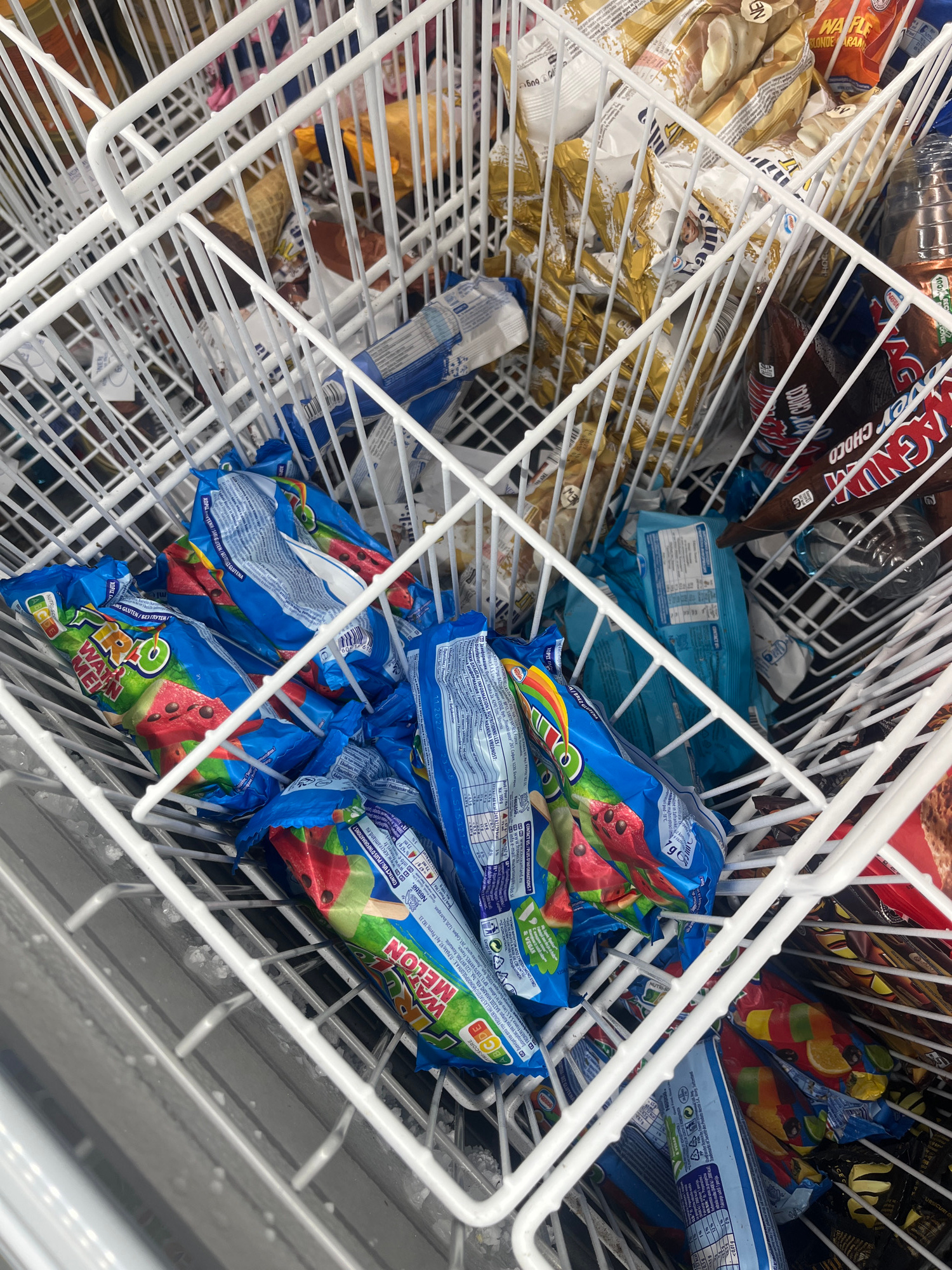 The image shows a freezer bin filled with various ice cream products. Several packages of ice cream are visible: * "Pirulo Watermelon" popsicles are in the foreground, packaged in blue wrappers wit…read more