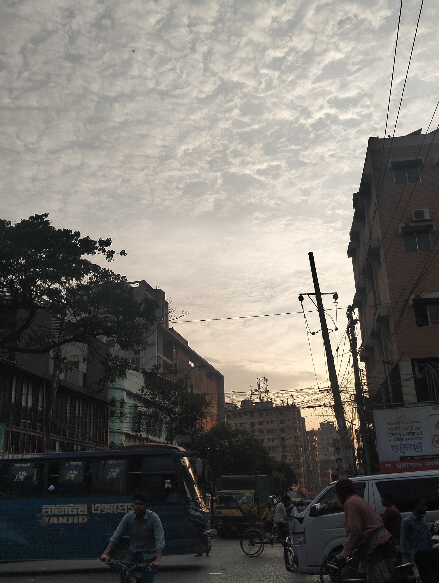 The image depicts a bustling street scene in Dhaka, Bangladesh. The sky is overcast with altocumulus clouds. A dark-colored bus labeled "নীলাচল এক্সপ্রেস Tanjid" is partially visible on the left, with…read more