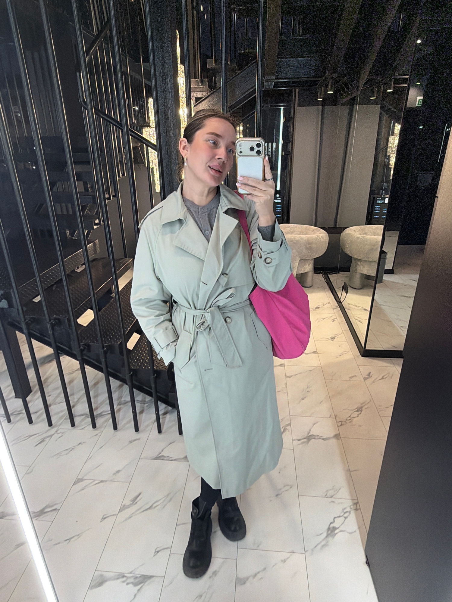 A woman is taking a selfie in what appears to be the Mercury Tower in Moscow, Russia. She is wearing a light green trench coat over a grey top, black leggings, and black boots. She is holding a white…read more