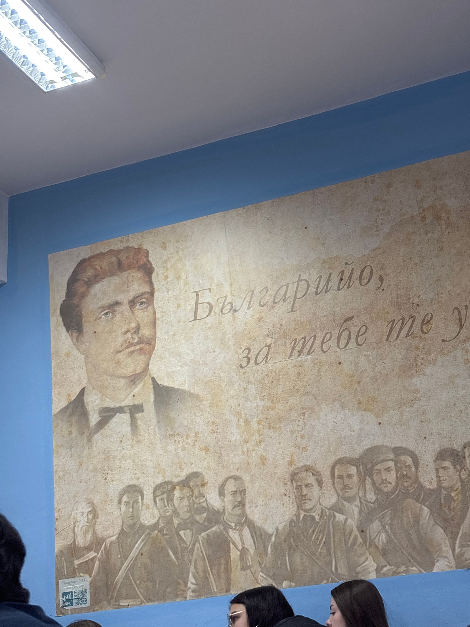 A large mural occupies part of a wall, likely inside a building in Haskovo, Bulgaria. The mural is predominantly beige and brown, with a blue border framing it. The artwork depicts a large portrait of a man with reddish-brown hair, followed by a group of at least ten men, most likely soldiers or revolutionaries. Above these figures, some Cyrillic text is visible, reading "България, за тебе ме у". In the lower left corner of the image, there is a bright, fluorescent light fixture on the ceiling. Partial visibility of individuals suggests the presence of onlookers examining the mural. A woman with dark hair stands to the right of the mural, and other people's heads are visible at the bottom. A QR code and other markings are also visible at the bottom right of the mural. | Open Wire