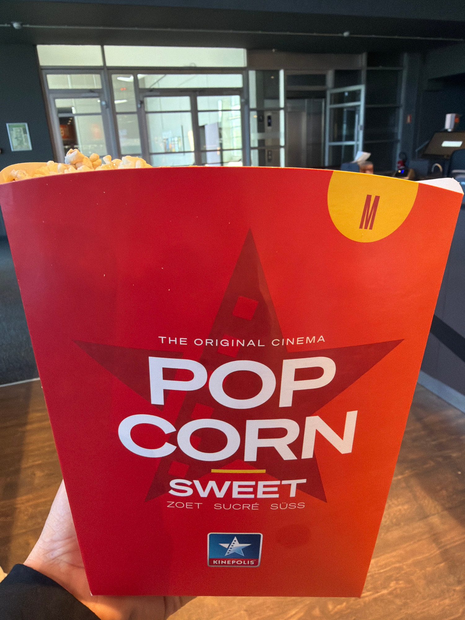 The image shows a box of "Sweet Popcorn" from Kinepolis, a cinema chain. The box is red with white lettering, and the words "Sweet," "Zoet," "Sucre," and "Süss" are printed on it. The box is held by a…read more