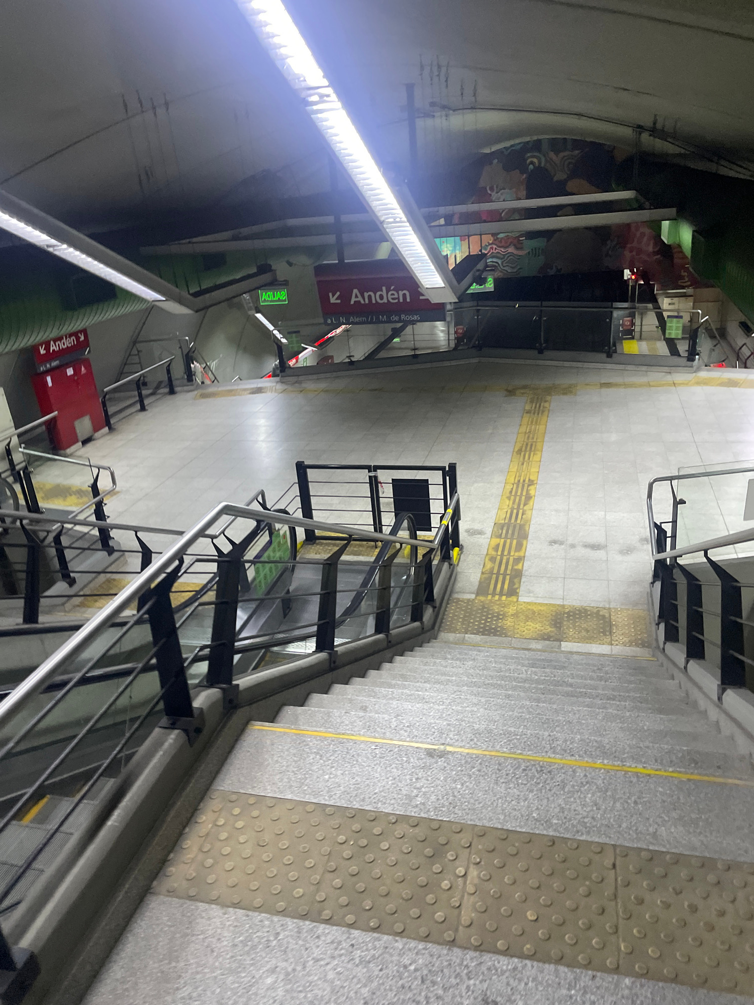 The image shows an interior view of a subway station in Buenos Aires, Argentina. There are staircases with metal railings leading downwards. The floor has tactile paving and a yellow guiding line for…read more