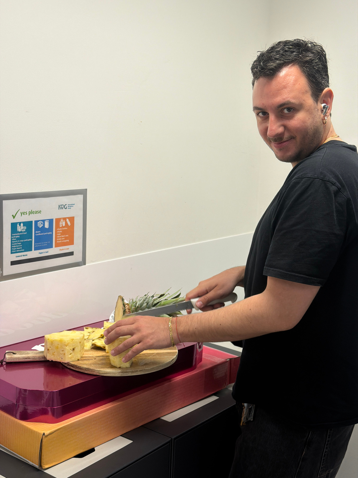 A slightly angled, medium shot depicts a man cutting pineapple on a wooden cutting board. He is positioned in front of a light-colored wall featuring a recycling information sign labeled "yes please"…read more