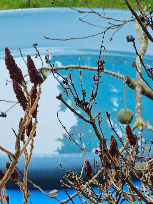The image displays an outdoor scene in Esch-sur-Alzette, Luxembourg, characterized by dormant vegetation in the foreground against a predominantly blue background. The foreground is dominated by a de…read more