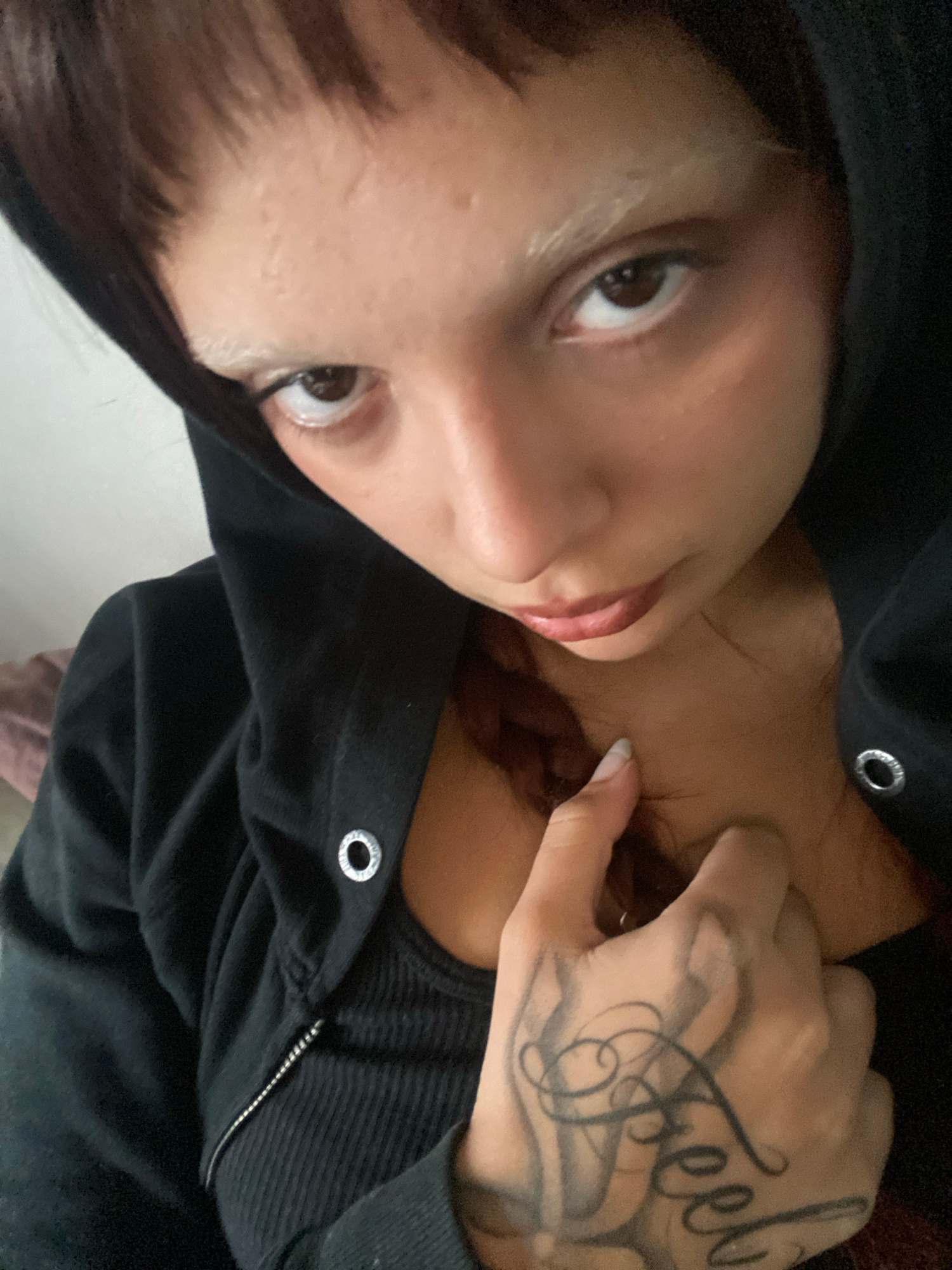 A close-up, angled shot depicts a woman with brown hair and eyes. She is wearing a black hooded sweatshirt that is partially zipped. Her hand, adorned with a "Feel" tattoo, is near her neck. No detail…read more