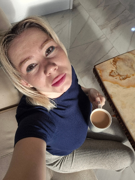 A blonde woman is captured from a high angle, wearing a dark blue top and textured grey pants. She's holding a mug of tan liquid, possibly tea or coffee, seated near a light-colored couch and marble-p…read more