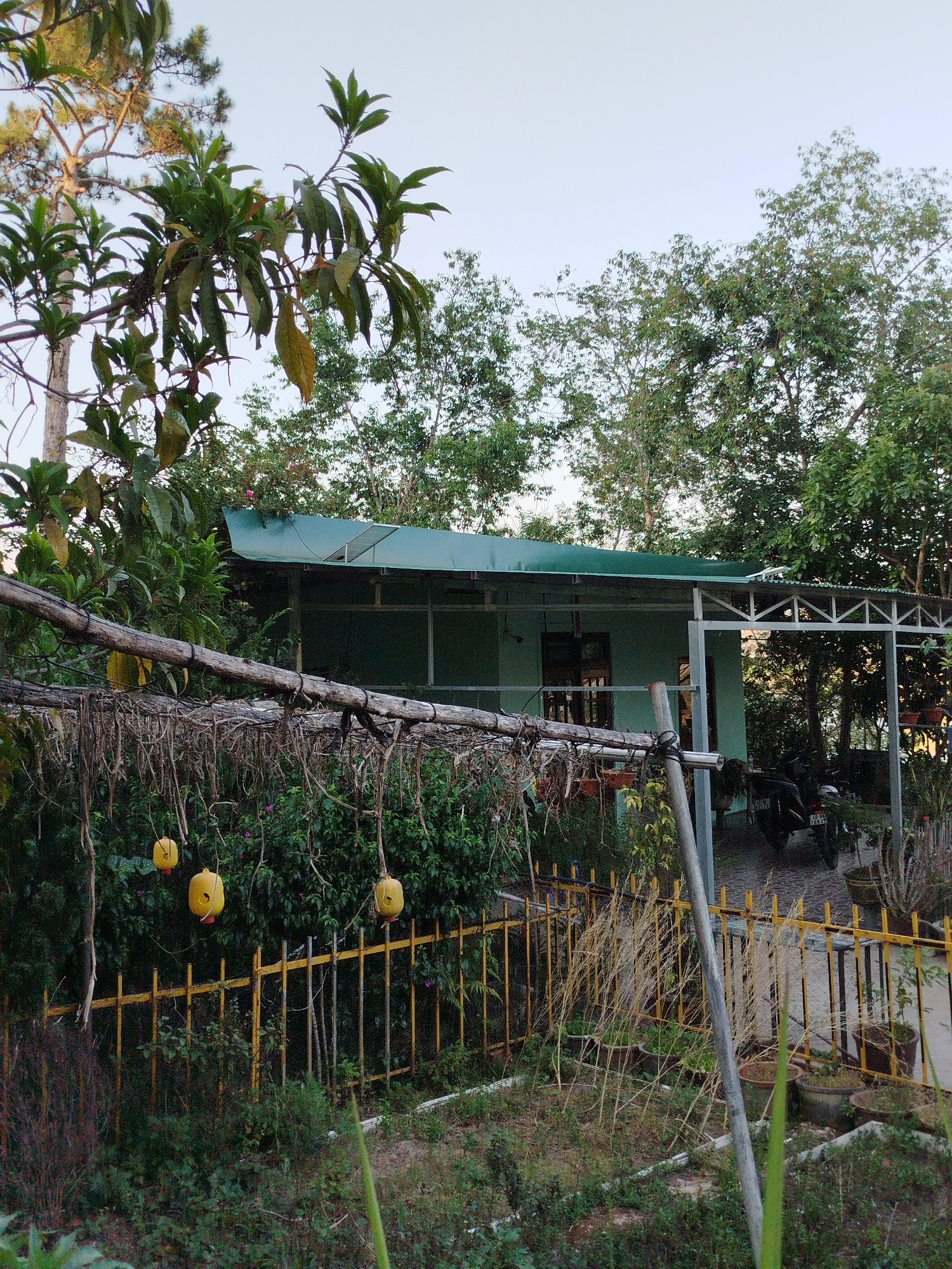 The image depicts a residential scene in Da Lat, Vietnam. A light green, single-story house with a green metal roof is partially obscured by dense foliage. A metal-framed awning extends from the house…read more