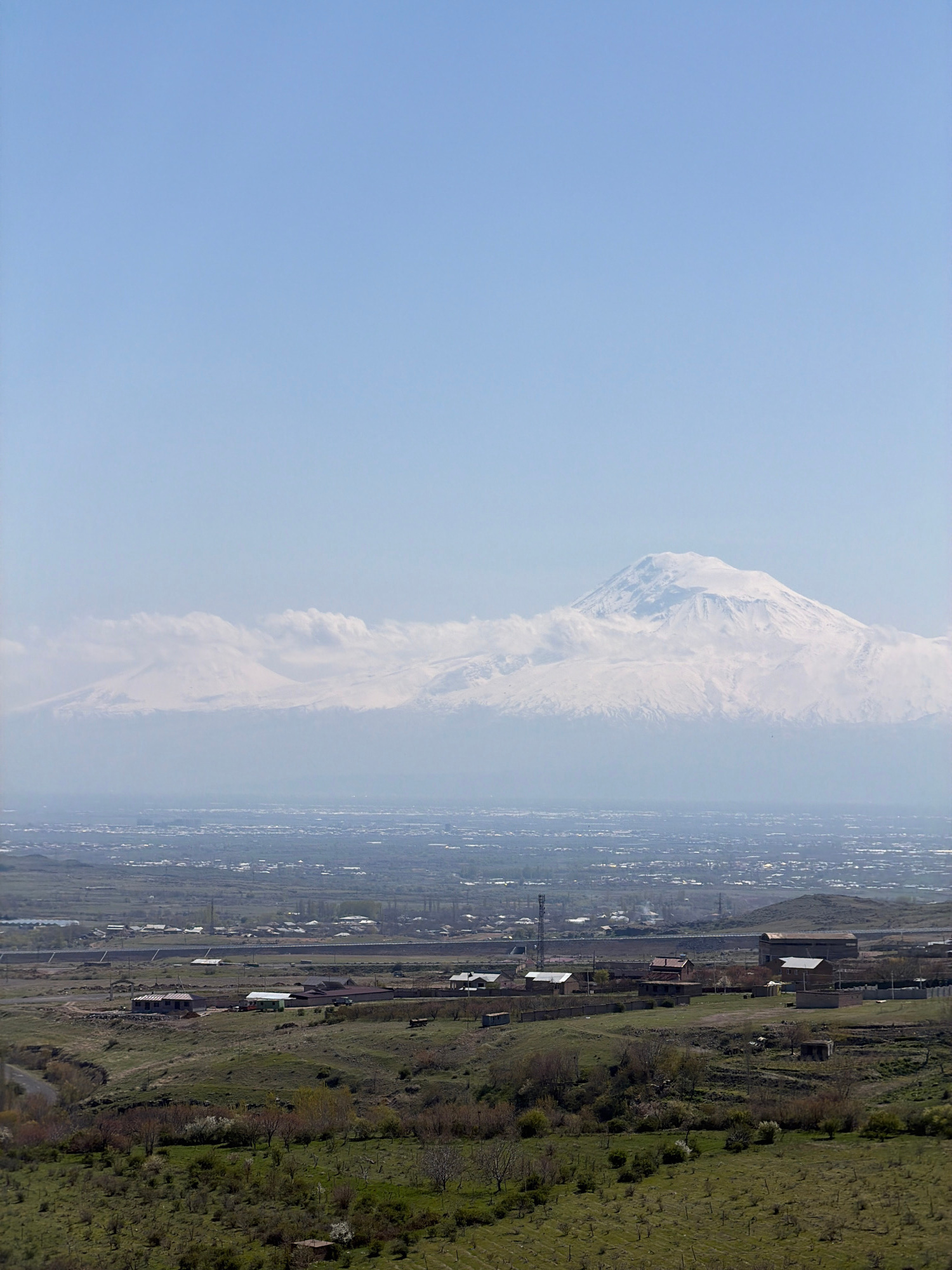 The image shows a view from Byurakan, Armenia, featuring Mount Ararat on the left. The scene includes a rural landscape transitioning from green fields on the right to a town-like area stretching towa…read more