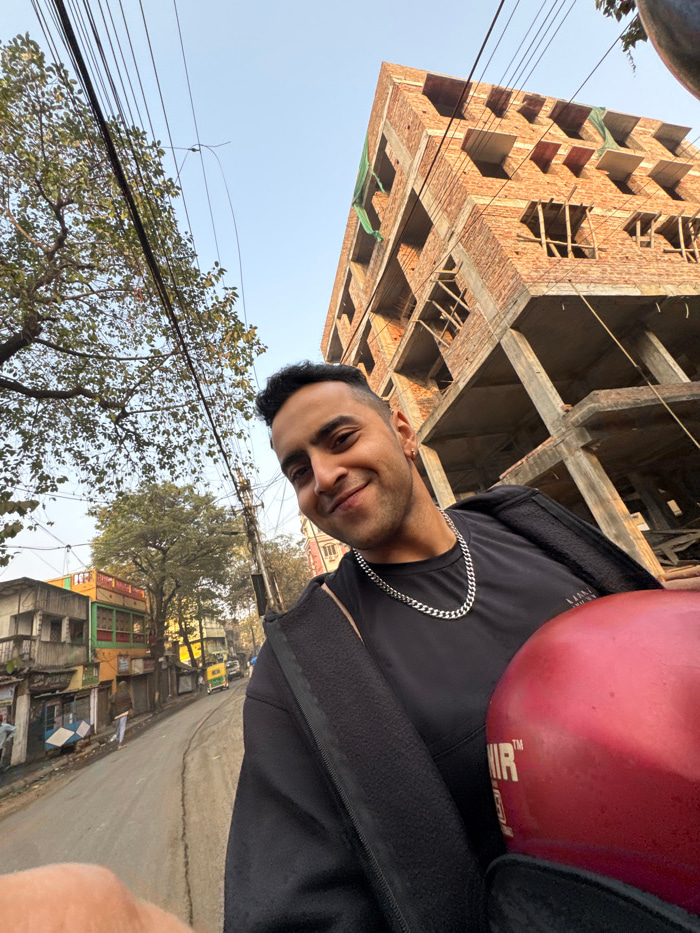 A man smiles at the camera while presumably riding a motorbike, wearing a black shirt and silver chain. He has a helmet on. The background includes an unfinished brick building, trees with bare branch…read more