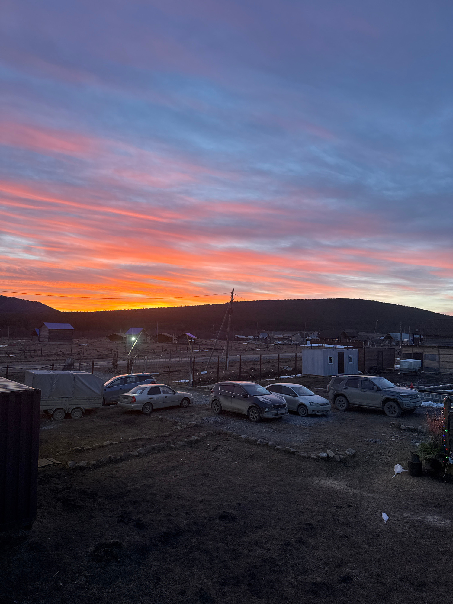 This image captures an outdoor scene in the city of Tyulyuk, Russia, at either sunrise or sunset. The sky exhibits horizontal bands of intense orange and pink clouds along the horizon, transitioning t…read more