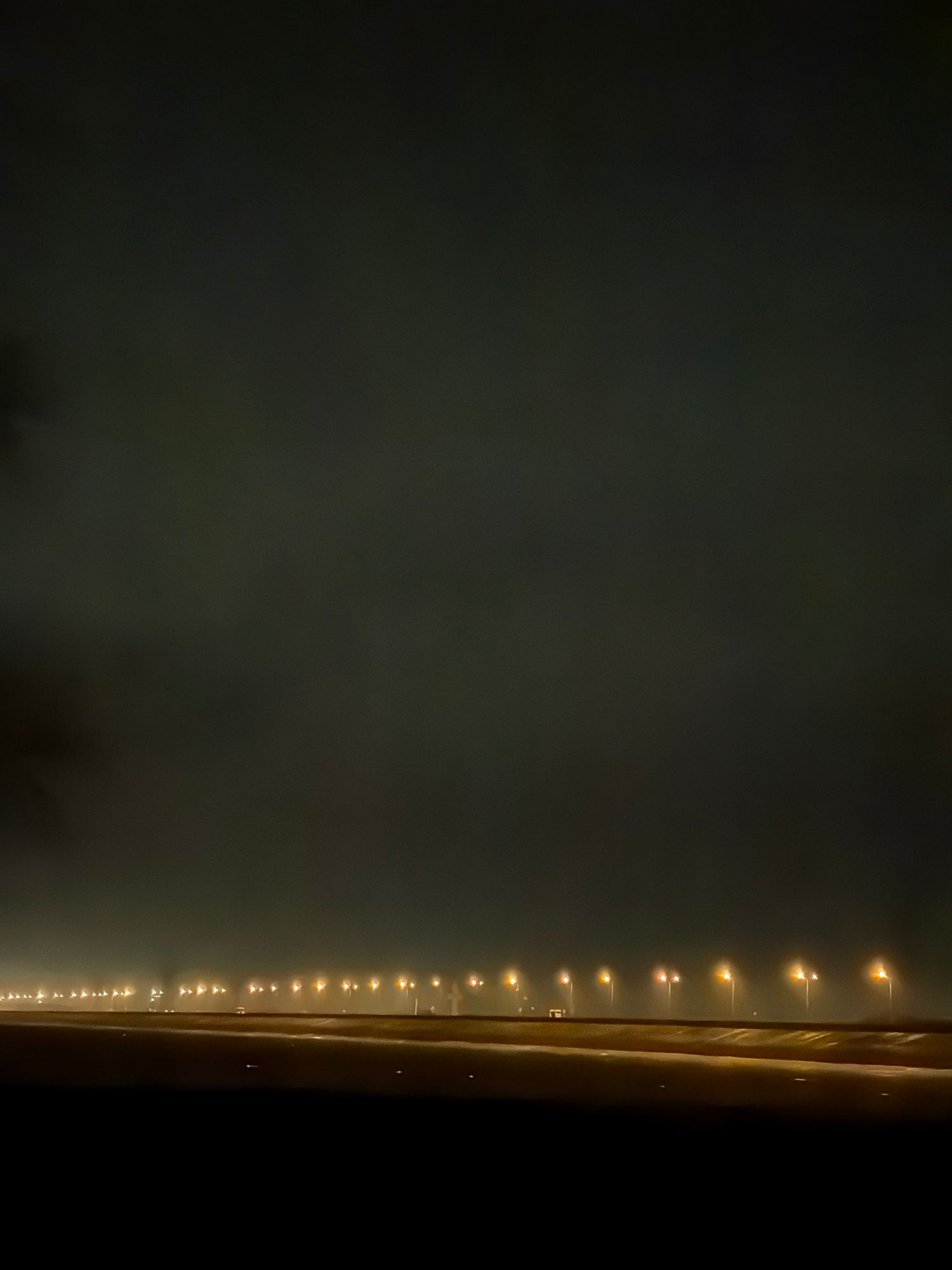 The image shows a night scene along a road or bridge in Noviy, Russia. A row of evenly spaced, warm-toned streetlights stretches into the distance along the right side. The left side of the image show…read more