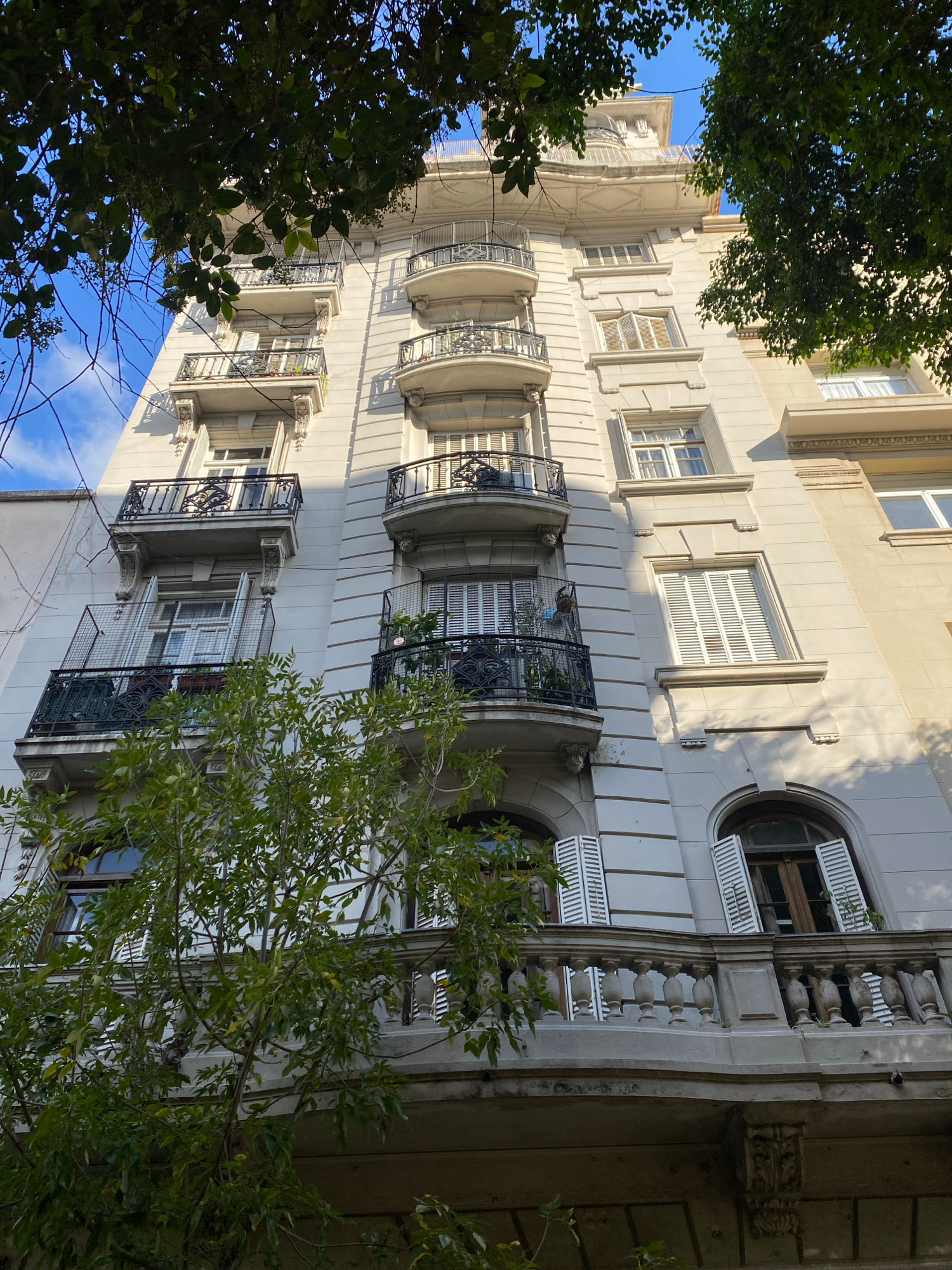 The image depicts a multi-story building facade in Buenos Aires, Argentina. The building is light-colored with ornate architectural details, including projecting balconies with intricate wrought-ironβ¦read more