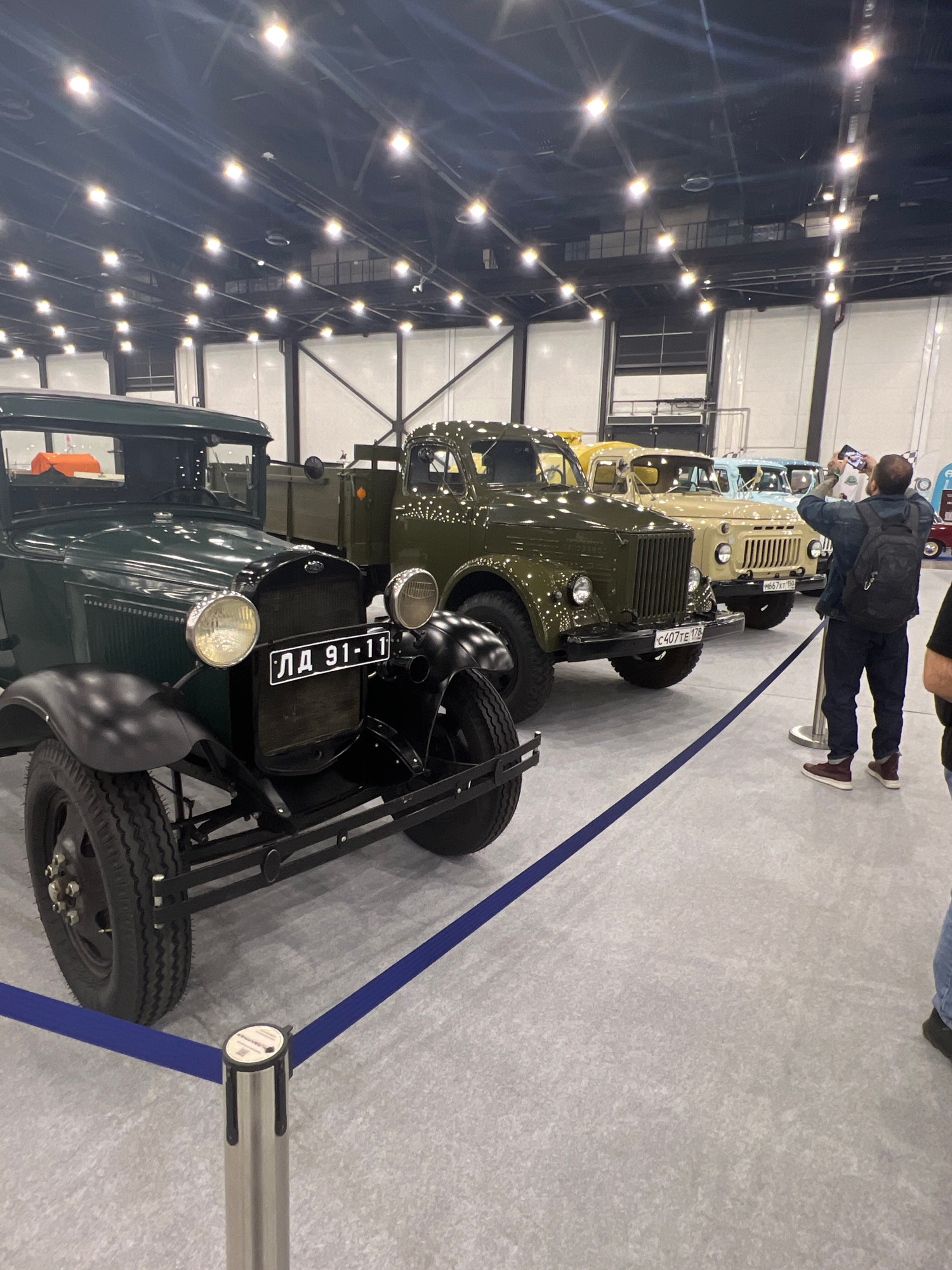 The scene depicts a display of vintage vehicles in what appears to be an indoor exhibition hall, likely in Unknown, Unknown. Overhead, the hall is illuminated by rows of evenly spaced lights. In the…read more