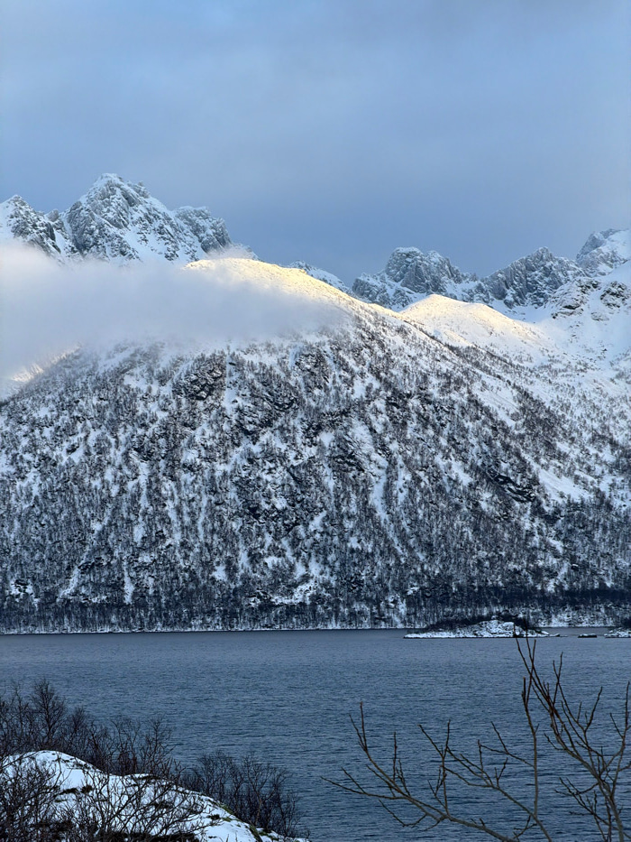 The image displays a panoramic winter landscape in Laupstad, Norway. The foreground consists of snow-covered ground with sparse, bare deciduous branches extending from the lower left and right. A body…read more