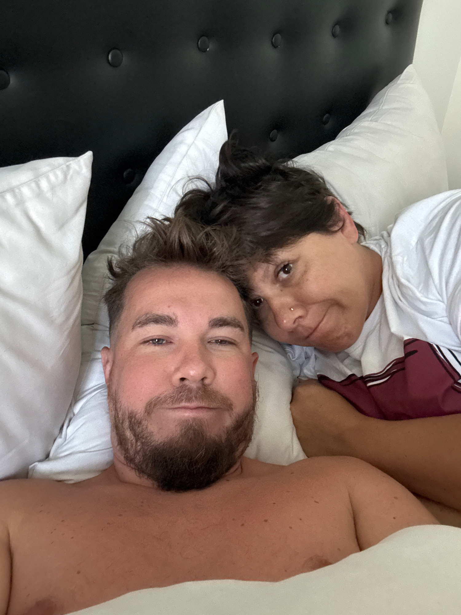 Two people lie in a bed. One has dark hair and a nose piercing, wearing a maroon and white shirt, lying on a white pillow. The other has light hair and a beard, wearing a white shirt, also lying on a…read more