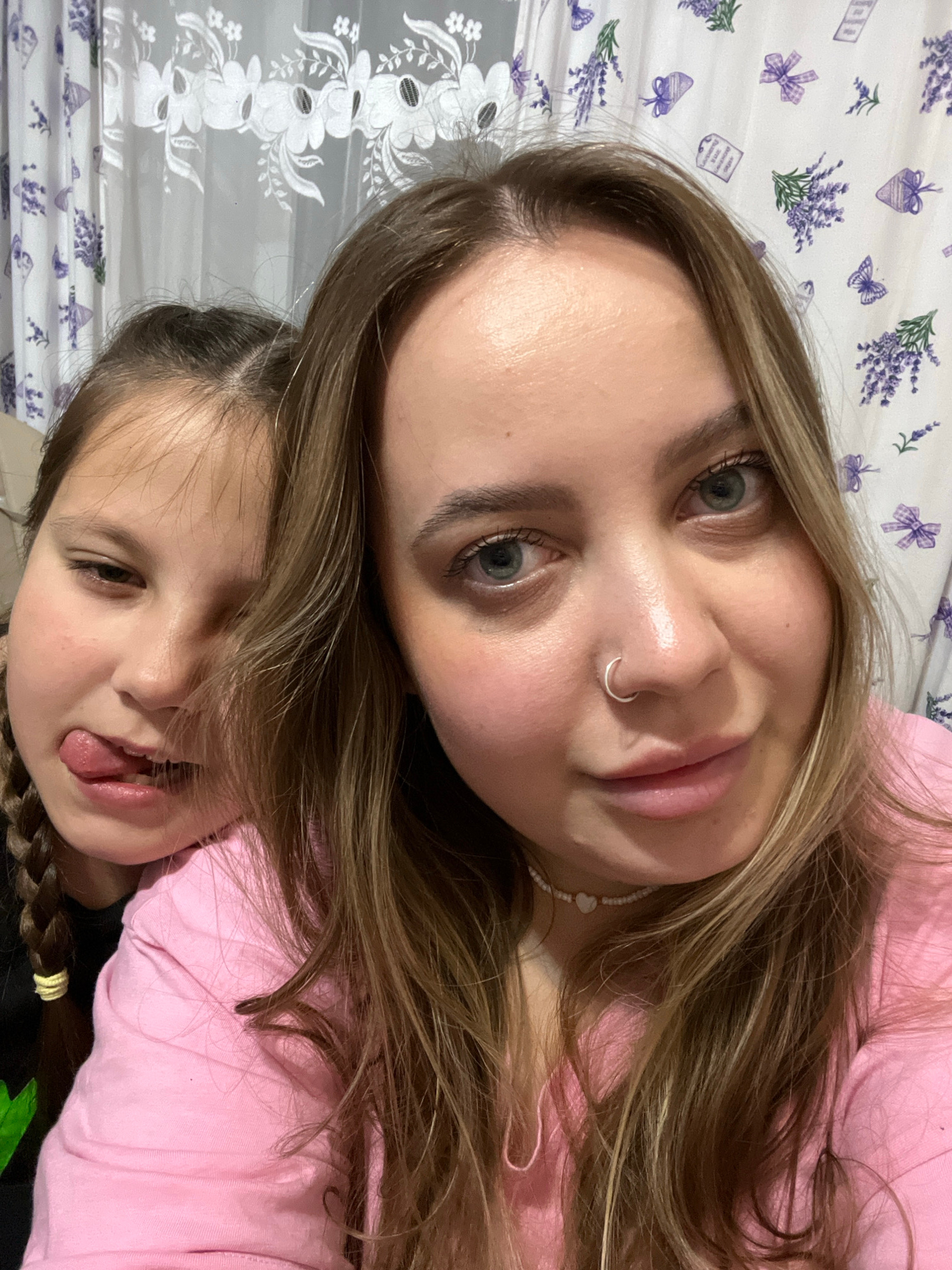 This image features two females, an adult and a child, captured in a close-up, informal portrait. The photograph appears to be taken from a top-down perspective and is rotated roughly 90 degrees count…read more