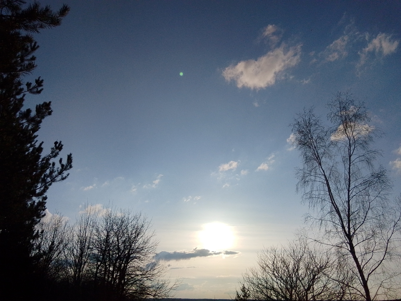 This image captures a serene outdoor landscape, likely in a rural or forested area, set against a vast sky. The scene is dominated by natural elements, with no people visible. The sky, transitioning…read more