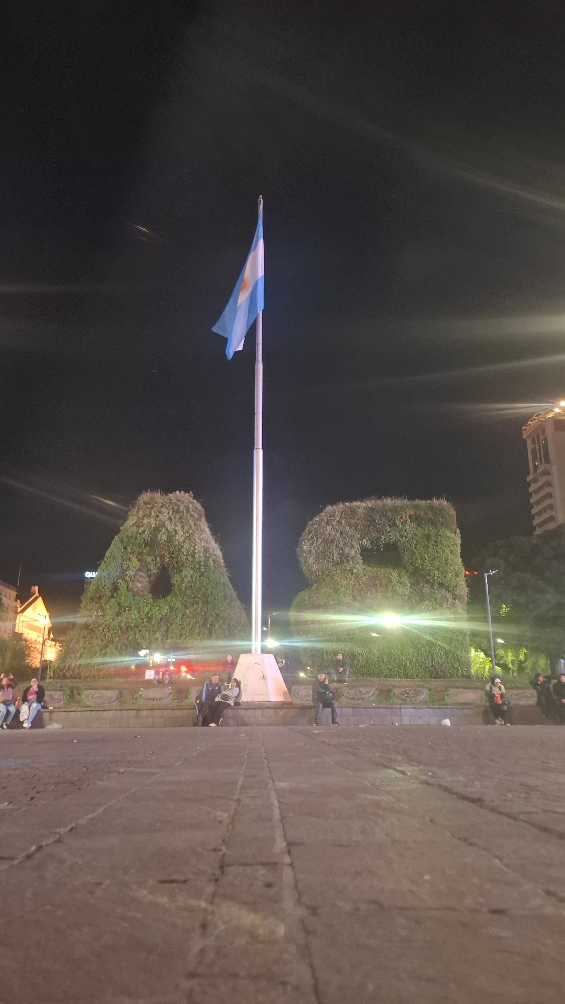 A low-angle, medium shot taken at night captures a view of Plaza de Mayo in Buenos Aires, Argentina. A cobblestone pathway leads to the base of a tall flagpole. The Argentine flag, illuminated by theβ¦read more